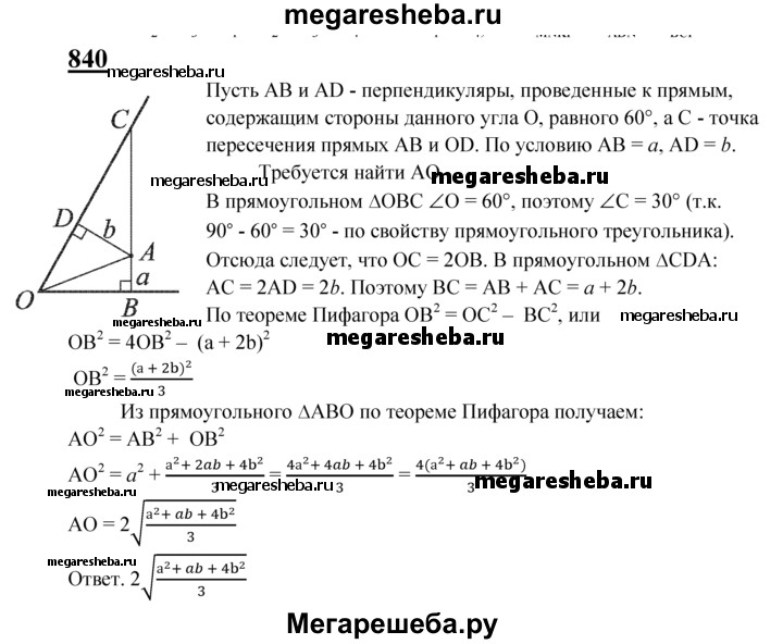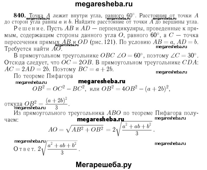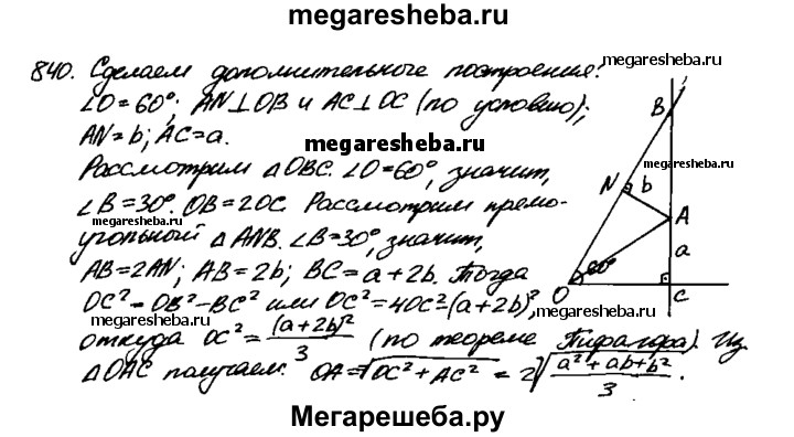 840 Точка А лежит внутри угла, равного 60°. Расстояния от точки А до сторон угла равны а и Ь. Найдите расстояние от точки А до вершины угла.