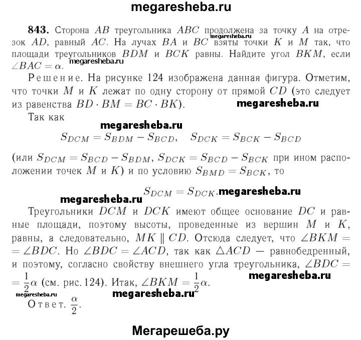 843 Сторона АВ треугольника ABC продолжена за точку А на отрезок AD, равный АС. На лучах ВА и ВС взяты точки К и М так, что площади треугольников BDM и ВС К равны. Найдите угол ВКМ, если ∠BAC = а.
