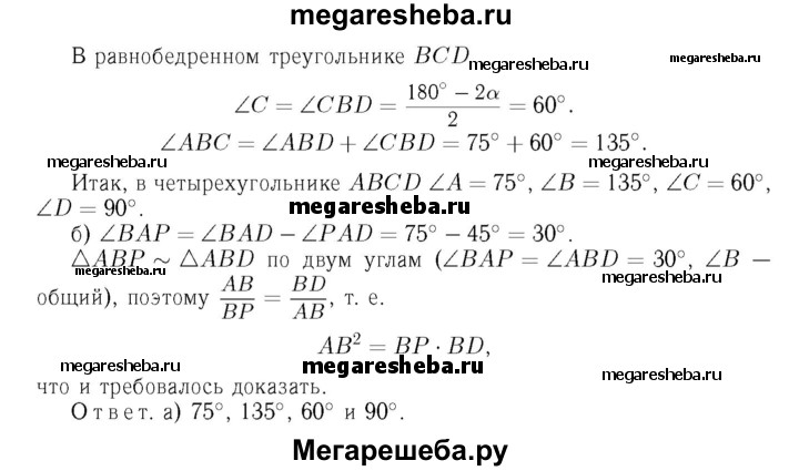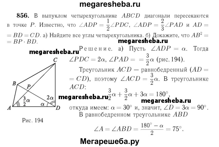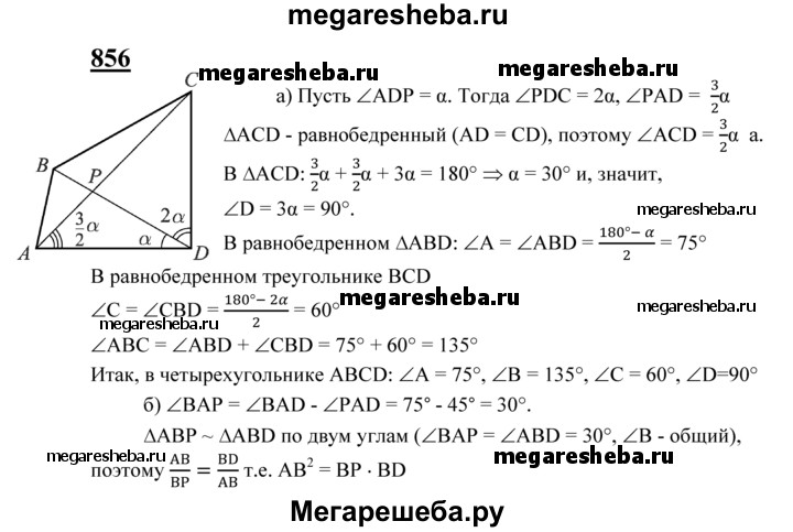 856 Диагонали выпуклого четырёхугольника ABCD пересекаются в точке Р. Известно, что ∠ADP = ½ ∠PDC, ∠ADP = 2/3∠PAD и AD = BD = CD. а) Найдите все углы четырёхугольника, б) Докажите, что АВ2 = BP • BD.