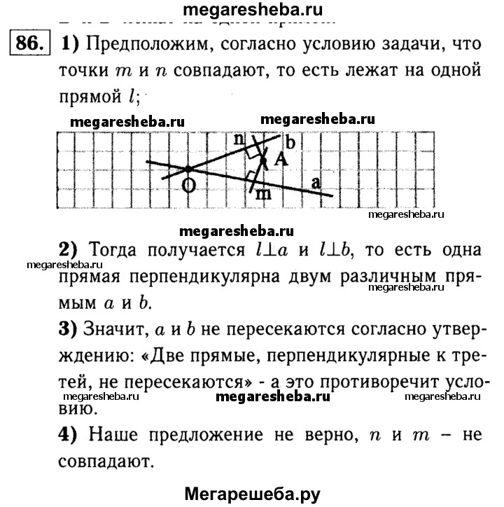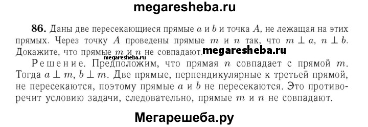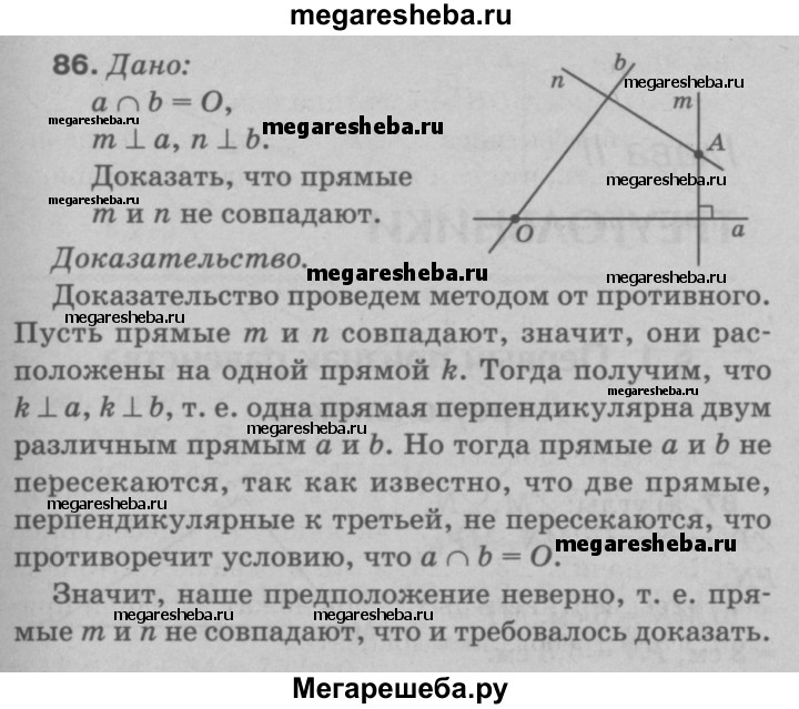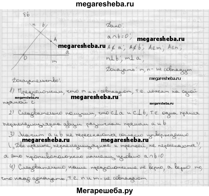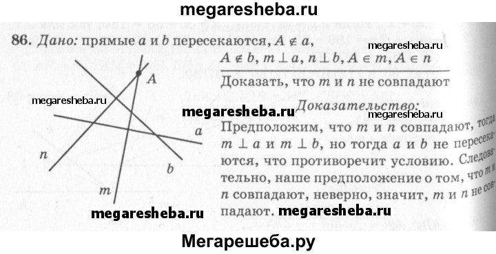 86 Даны две пересекающиеся прямые а и b и точка А, не лежащая на этих прямых. Через точку А проведены прямые т и п так, что m⊥а, n⊥b. Докажите, что прямые m и n не совпадают.
