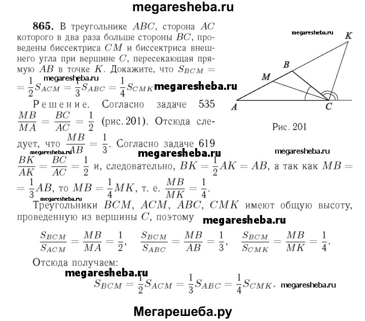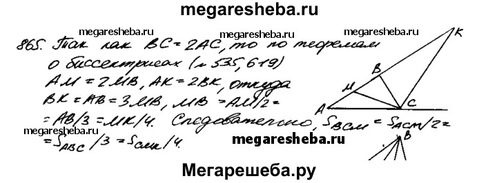 865 В треугольнике ABC, сторона АС которого в два раза больше стороны ВС, проведены биссектриса СМ и биссектриса внешнего угла при вершине С, пересекающая прямую АВ в точке К. Докажите, что SBCM = ½ SACM = 1/3SABC = ½ SCMK.
