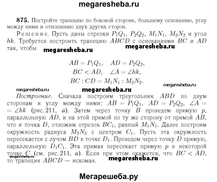 875 Постройте трапецию по боковой стороне, большему основанию, углу между ними и отношению двух других сторон.