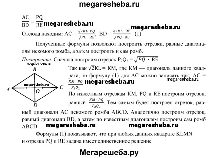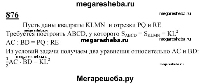 876 Постройте ромб, площадь которого равна площади квадрата, если известно, что отношение диагоналей этого ромба равно отношению данных отрезков.