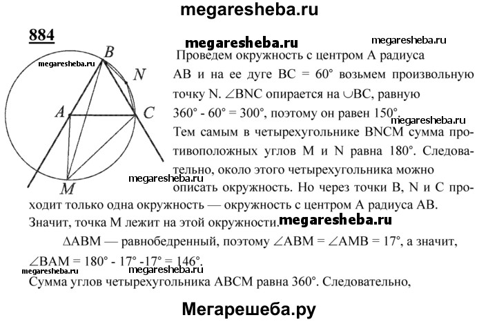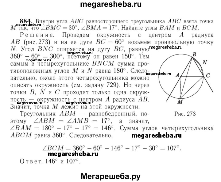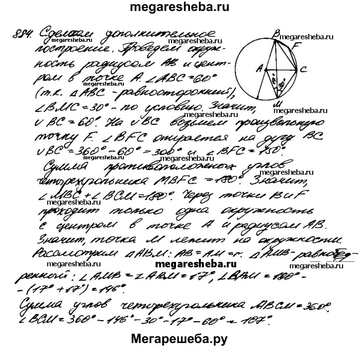 884 Внутри угла АBС равностороннего треугольника ABC взята точка М так, что ∠BMC = 30°,∠BMA = 17°. Найдите углы ВАМ и ВСМ.