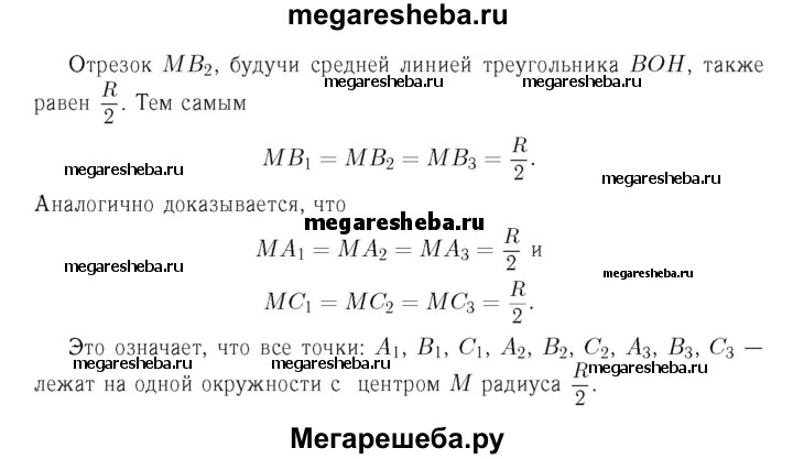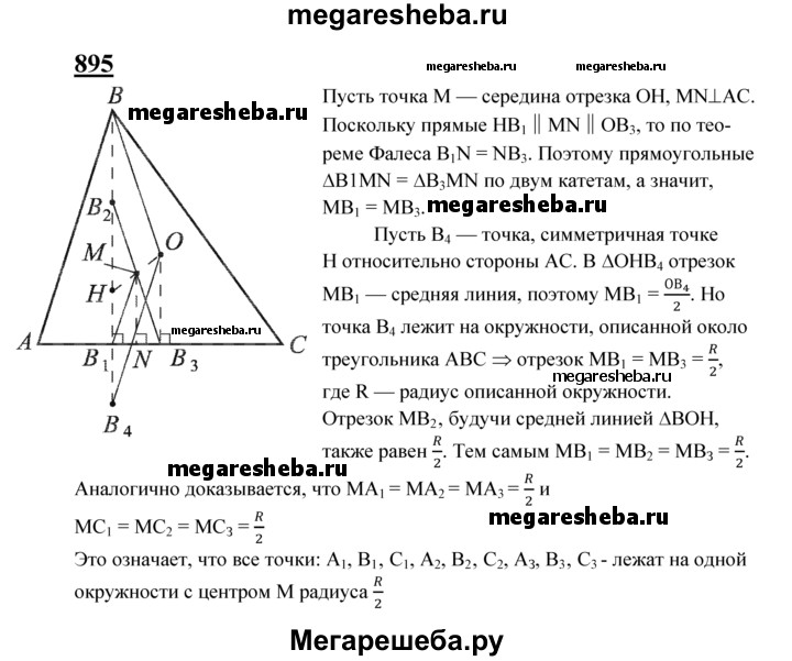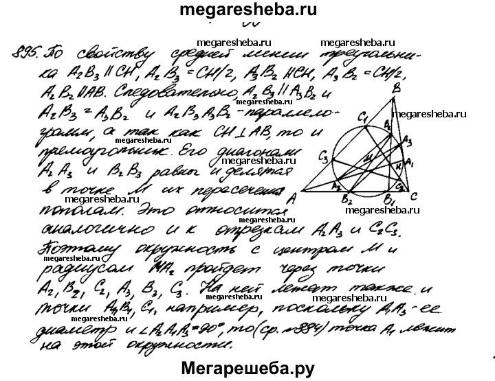 895 Для неравностороннего треугольника ABC точка О является центром описанной окружности, Н — точка пересечения прямых, содержащих высоты АА1, ВВ1 и СС1, точки А2, В2, С2 — середины отрезков АН, ВН, СН, а точки А3, В3, С3 — середины сторон треугольника ABC. Докажите, что точки А1, В1, С1, А2, В2, С2, А3, В3, С3 лежат на одной окружности (окружность Эйлера).