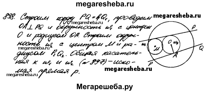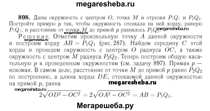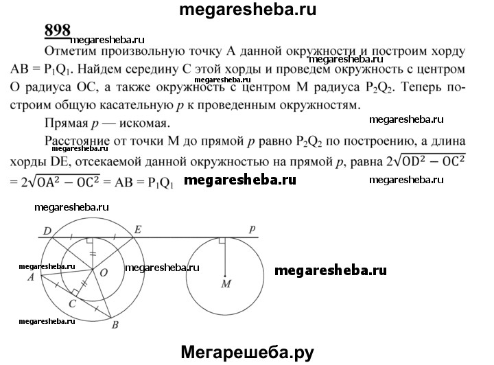 898 Даны окружность с центром О, точка М и отрезки Р1Q1 и P2Q2• Постройте прямую р так, чтобы окружность отсекала на ней хорду, равную и расстояние от точки М до прямой р равнялось P2Q2.