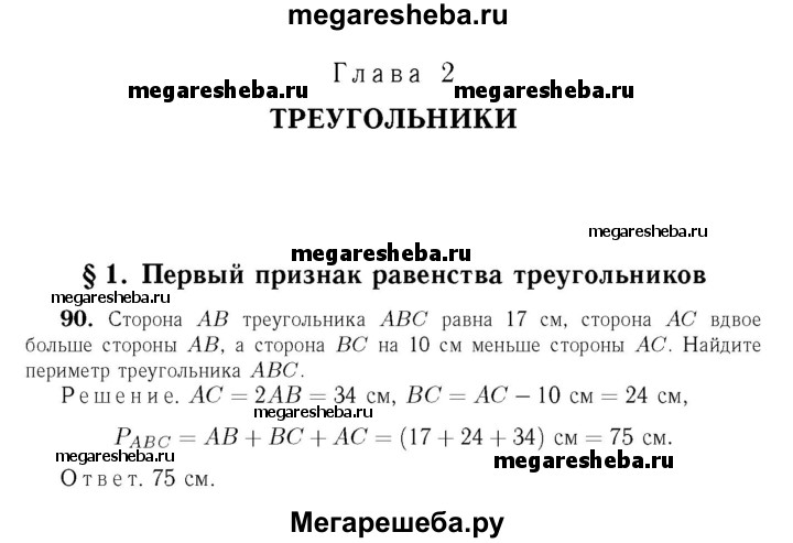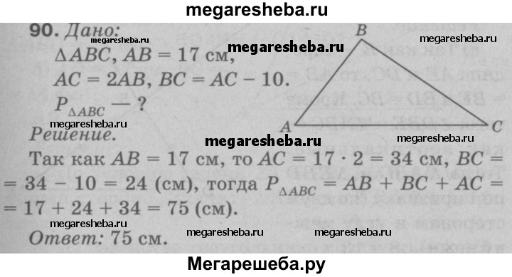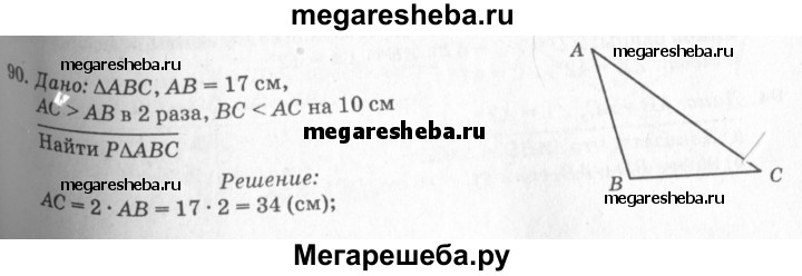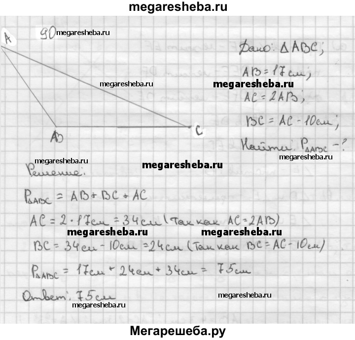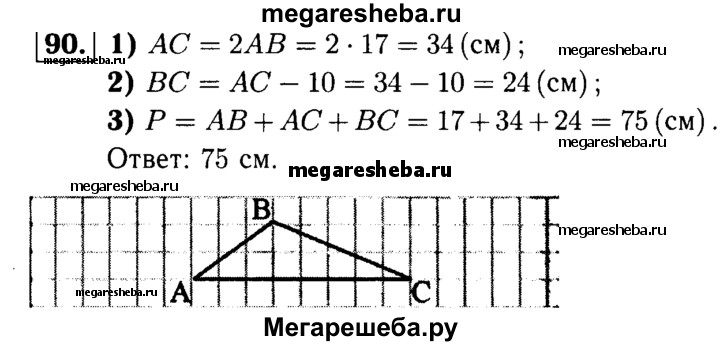 90 Сторона AB треугольника равна 17 см, сторона АС вдвое больше стороны АВ,а сторона BC на 10см меньше стороны AC. Найдите периметр треугольника ABC.
