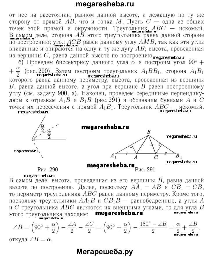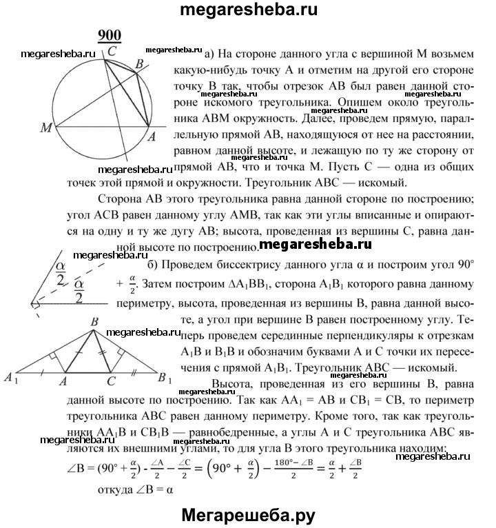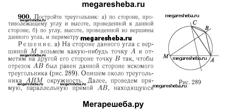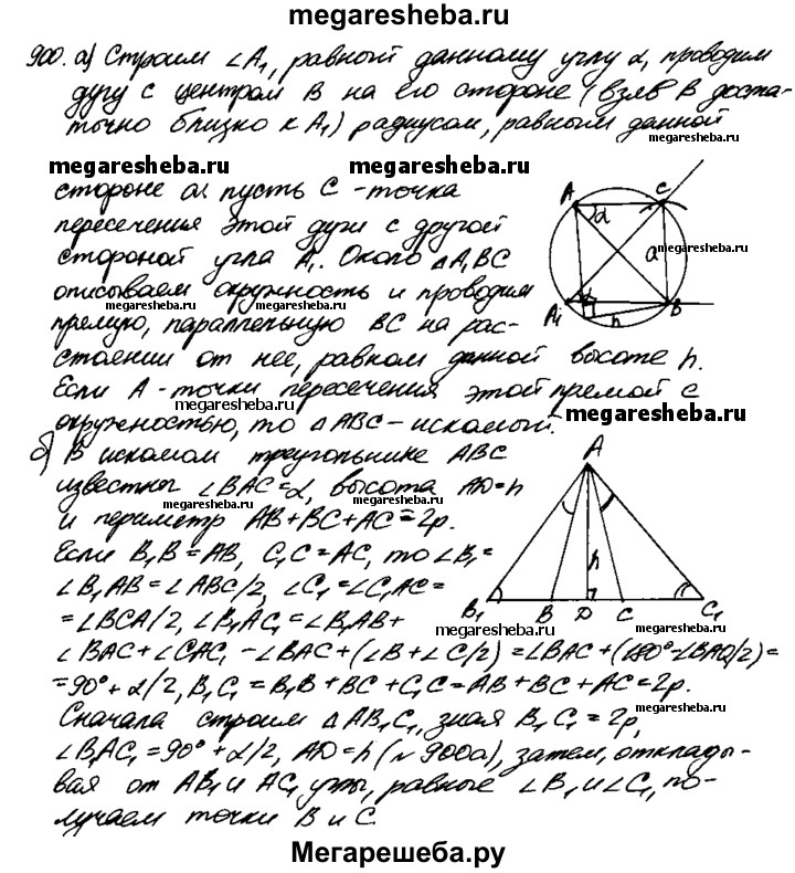 900 Постройте треугольник: а) по стороне, противолежащему углу и высоте, проведённой к данной стороне; б) по углу, высоте, проведённой из вершины данного угла, и периметру.