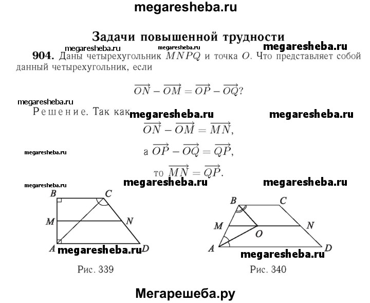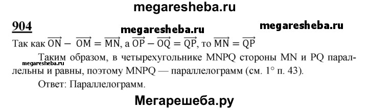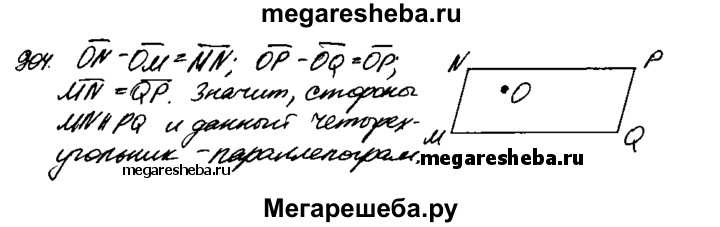 904 Даны четырёхугольник MNPQ и точка О. Что представляет собой данный четырёхугольник, если ON - ОМ = ОР - OQ1