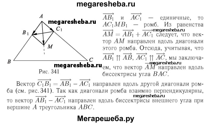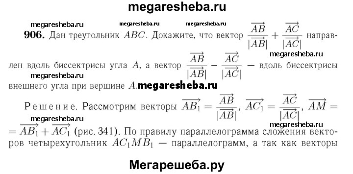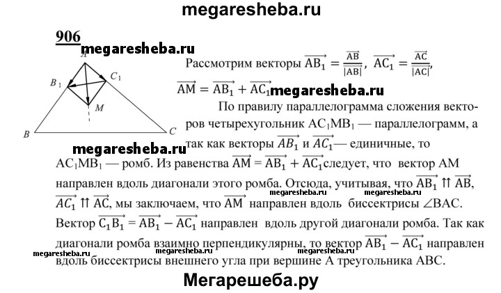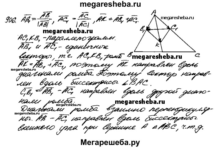 906 Дан треугольник ABC. Докажите, что вектор , AB/|AB|+ AC/|АС| направлен вдоль биссектрисы угла А, а вектор , AB/|AB| - AC/|АС| вдоль биссектрисы внешнего угла при вершине А.