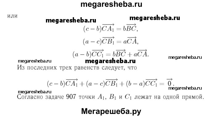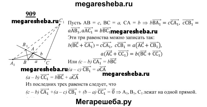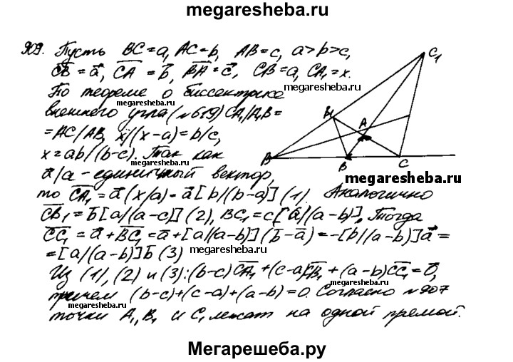 909 Биссектрисы внешних углов треугольника ABC при вершинах А, В и С пересекают прямые ВС, СА и АВ соответственно в точках А1 B1 и С1. Используя векторы, докажите, что точки Ах, Вх и Сх лежат на одной прямой.