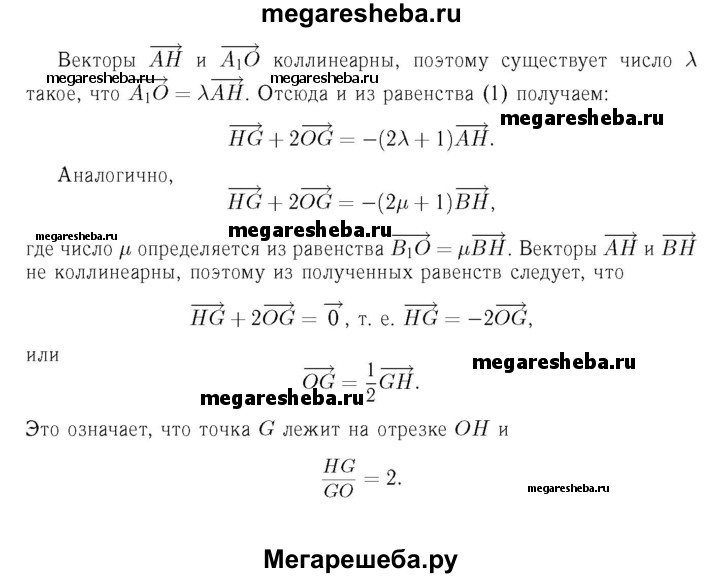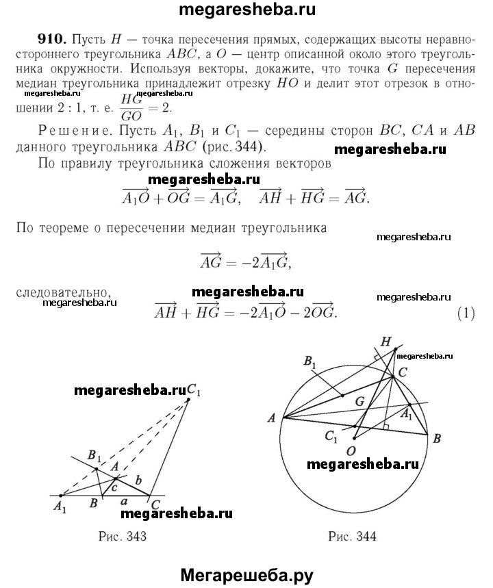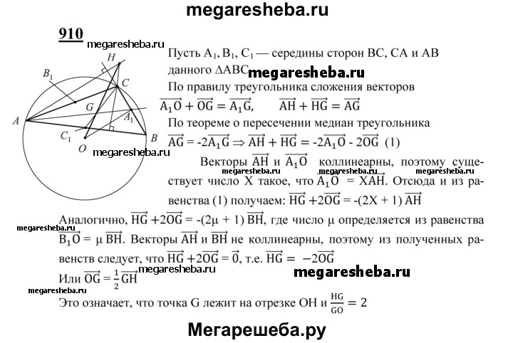 910 Пусть Н — точка пересечения прямых, содержащих высоты неравностороннего треугольника ABC, а О — центр описанной около этого треугольника окружности. Используя векторы, докажите, что точка G пересечения медиан треугольника принадлежит отрезку НО и делит этот отрезок в отношении 2:1, считая от точки Н, т. е. HG/GO = 2.