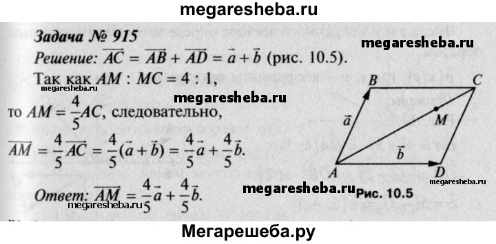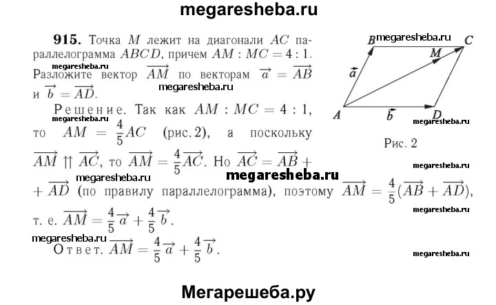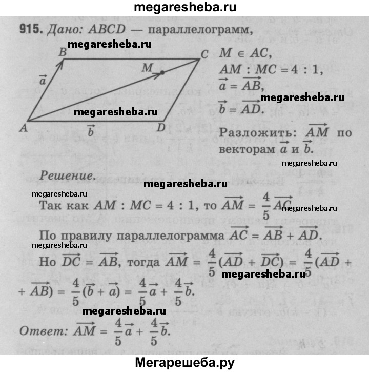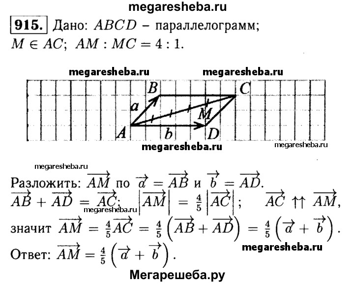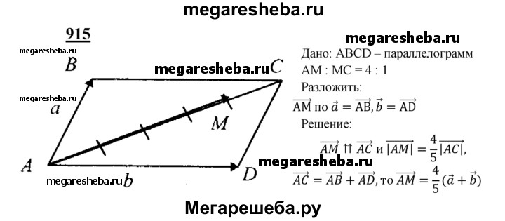 915 Точка М лежит на диагонали АС параллелограмма ABCD, причём AM : МС = 4:1. Разложите вектор AM по векторам а = АВ и b = AD.