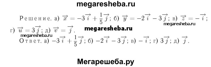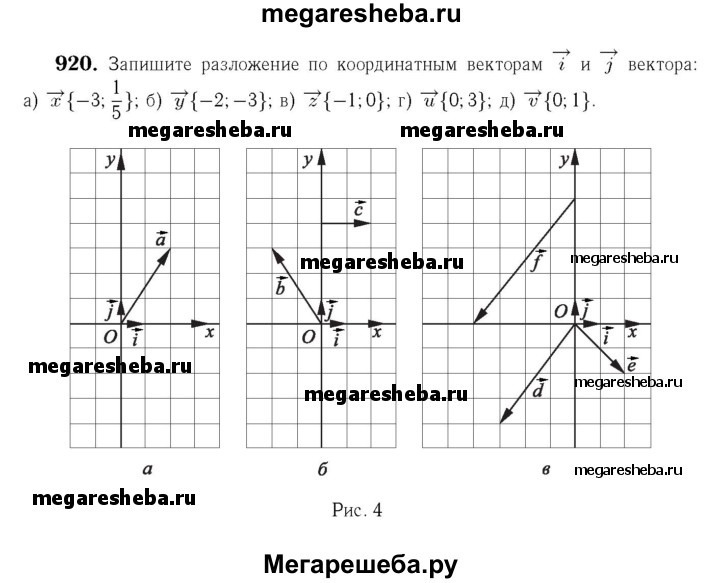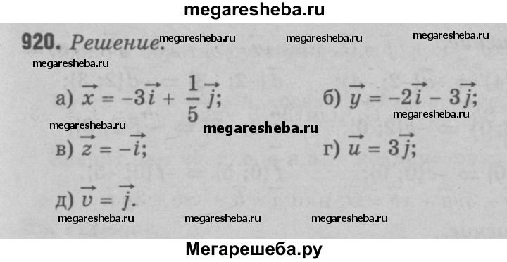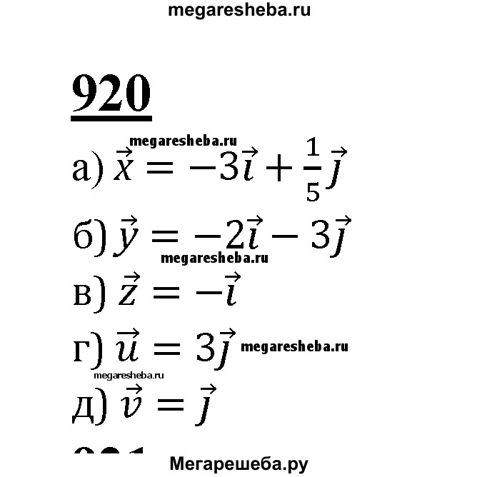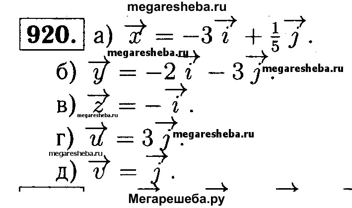 920 Запишите разложение по координатным векторам i и у вектора: а)х{-3; 1/5}; б) у {-2; -3}; в)z {-1;0}; г) u {0;3}; Д) v {0; 1}.
