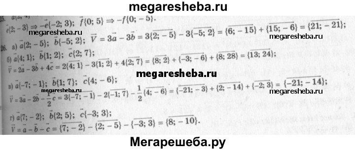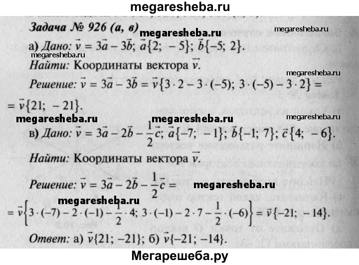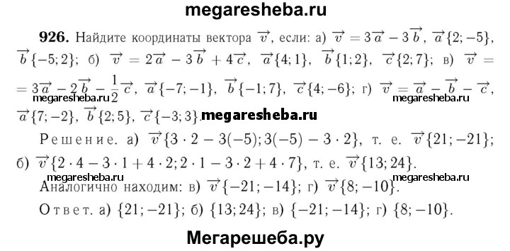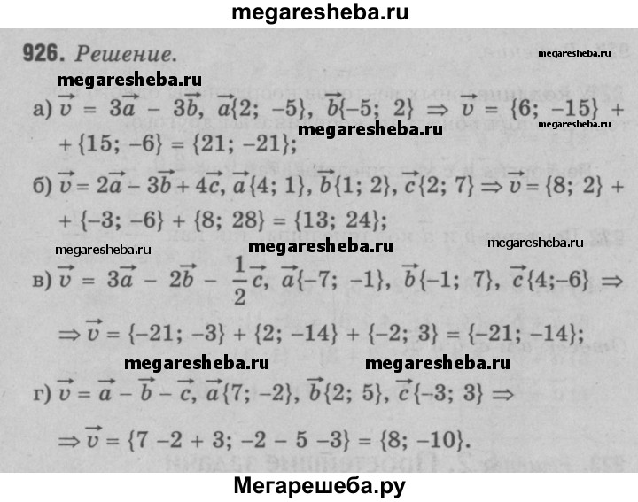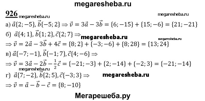 926 Найдите координаты вектора v, если: а) и = 3а - 3b, а {2; -5}, b{-5; 2}; б) и = 2а - 3Ь + 4с, а{ 4; 1}, b {1; 2}, с (2; 7); в) v = 3a-2b- ½ c, а {-7; -1}, b {-1; 7}, c{4;-6}; г) v = a-b-c, а{7;-2}, b{2; 5}, с{-3; 3}.