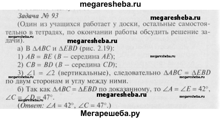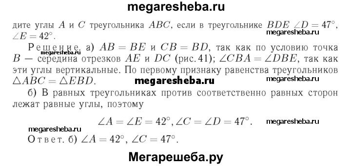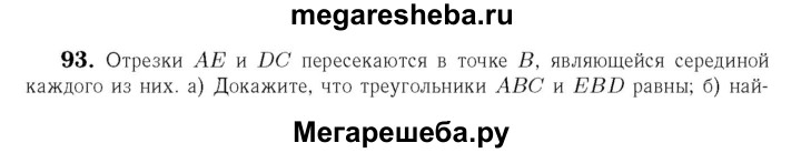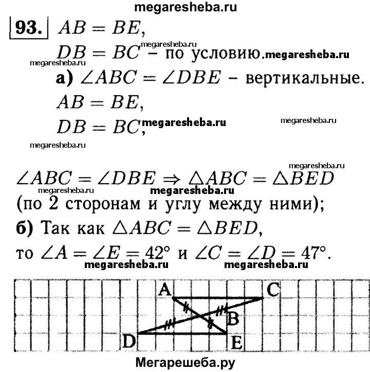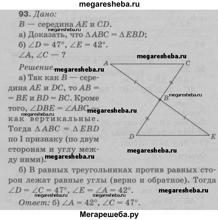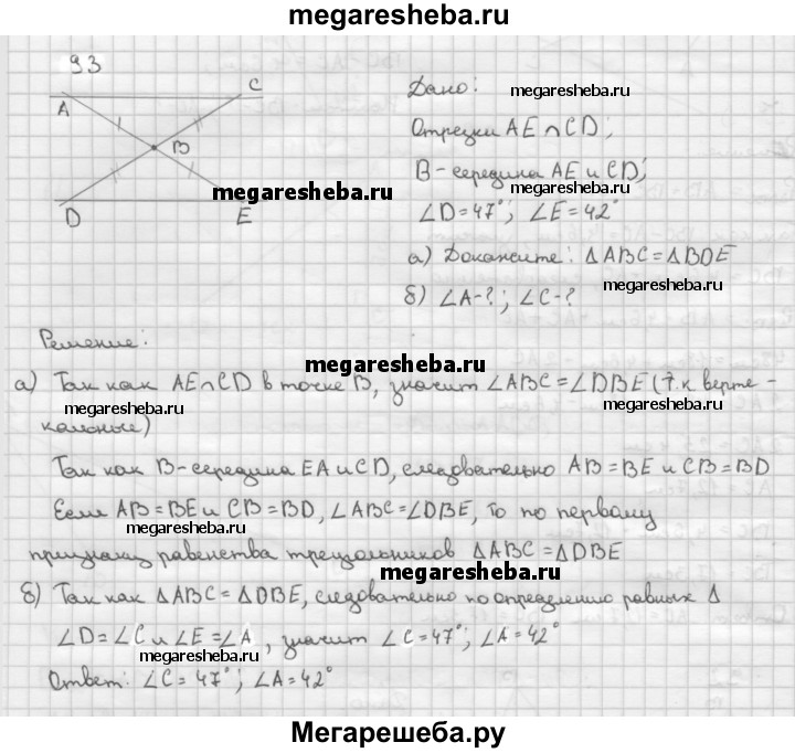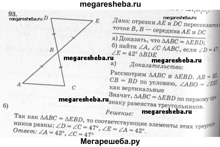 93 Отрезки АЕ и DC пересекаются в точке В, являющейся серединой каждого из них. а) Докажите, что треугольники ABC и EBD равны; б) Найдите углы A и C треугольника ABC, если в треугольнике BDE ∠D = 47, ∠E = 42