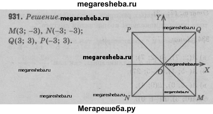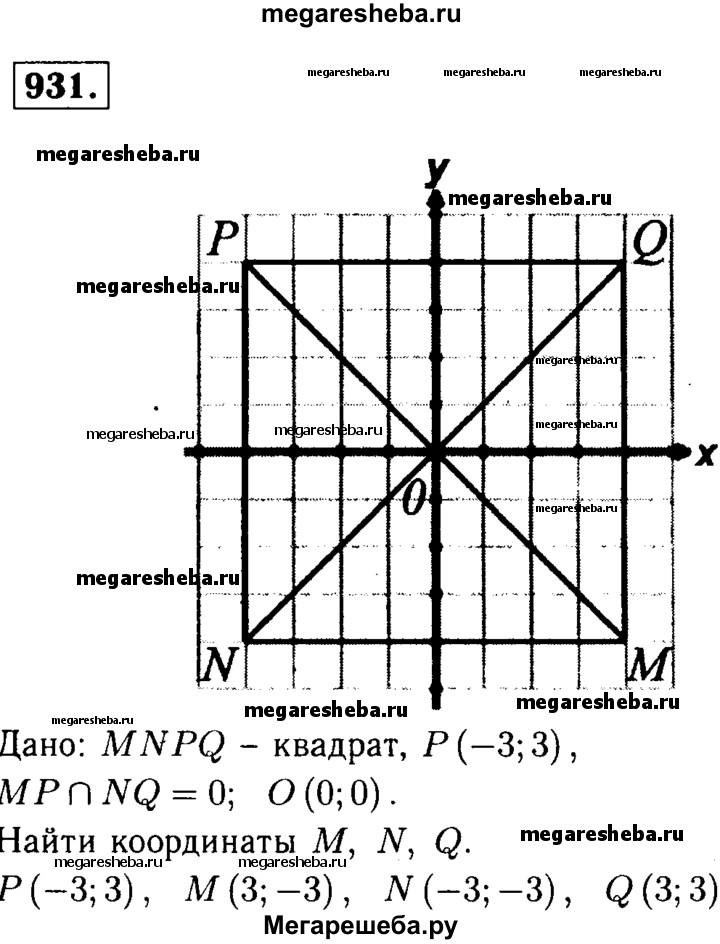 931 Начертите квадрат MNPQ так, чтобы вершина Р имела координаты (-3; 3), а диагонали квадрата пересекались в начале координат. Найдите координаты точек М, N и Q.