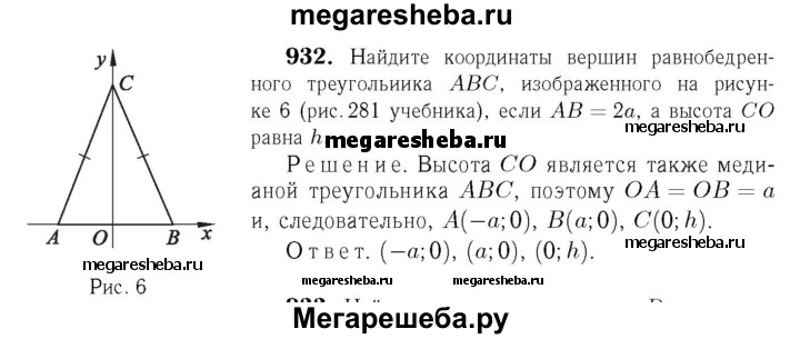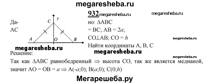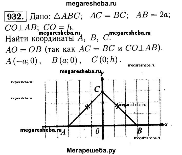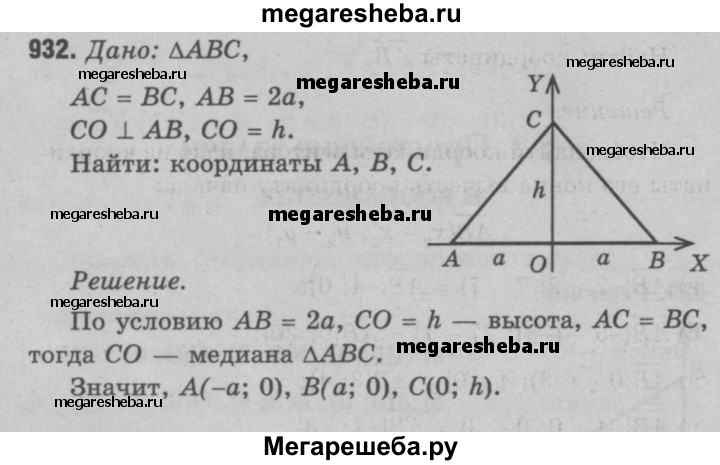932 Найдите координаты вершин равнобедренного треугольника ABC, изображённого на рисунке 281, если АВ = 2а, а высота СО Рис 281 равна h.