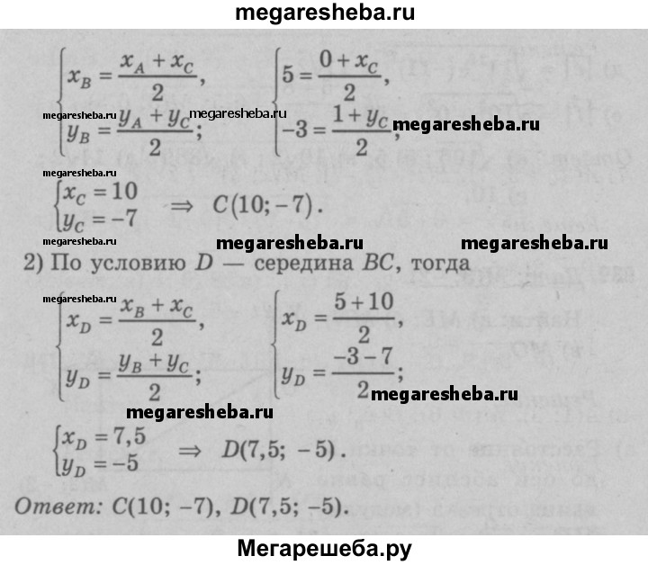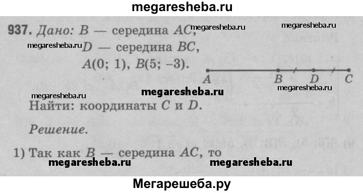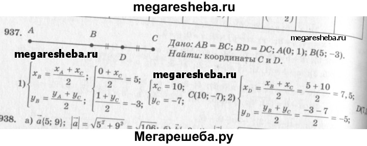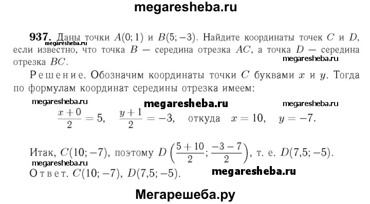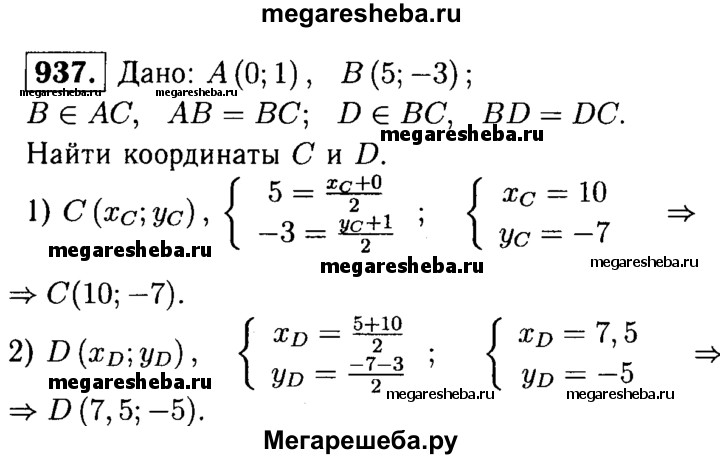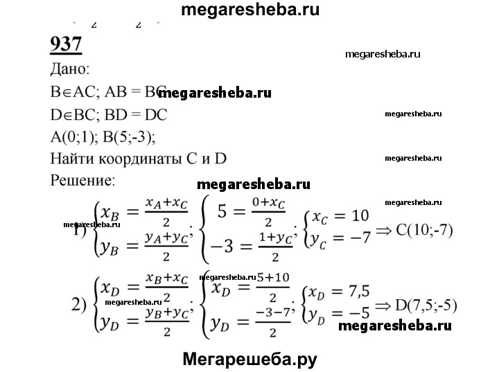 937 Даны точки А (0; 1) и B (5; -3). Найдите координаты точек С и D, если известно, что точка B — середина отрезка АС, а точка D — середина отрезка ВС.