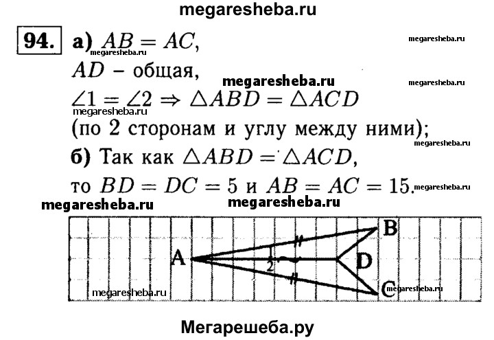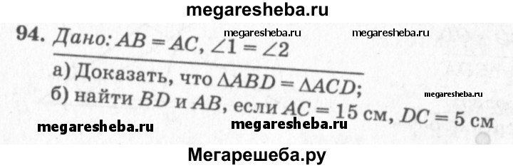 94 На рисунке 52 AB=AC, ∠1= ∠2. а) Докажите что треугольники ABC и AСD равны; б) Найдите BD и AB,если AC = 15см, DC = 5cм.