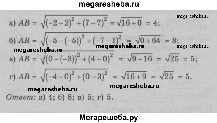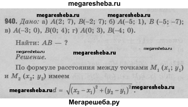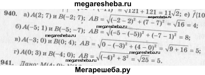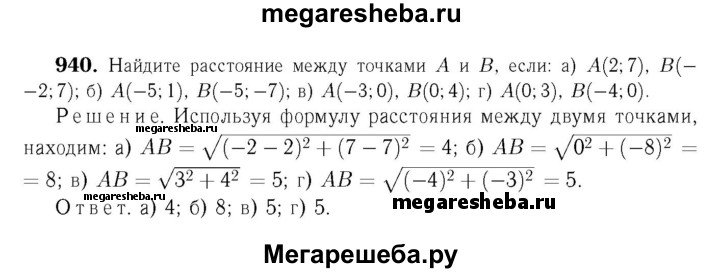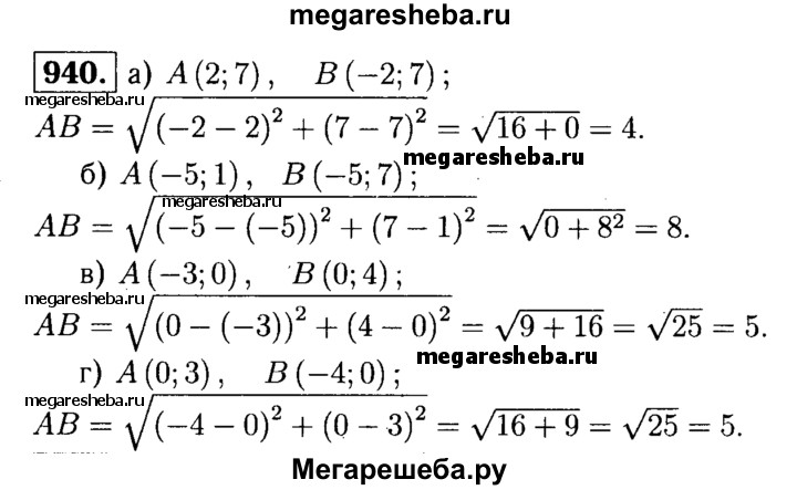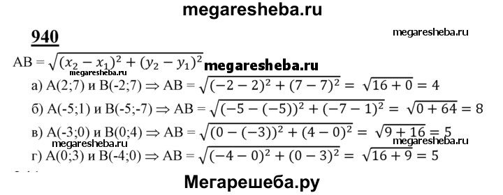 940 Найдите расстояние между точками А и B, если: а) А (2; 7), B (-2; 7); б) А (-5; 1), B (-5;-7); в) А (-3; 0), B (0; 4); г) А (0; 3), B (-4; 0).