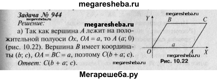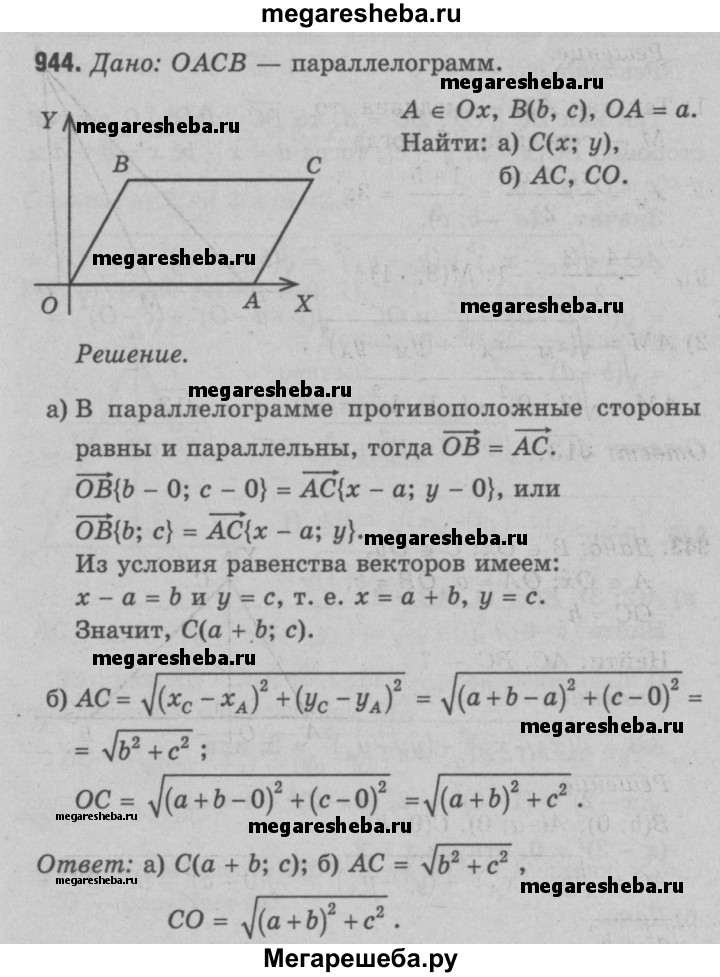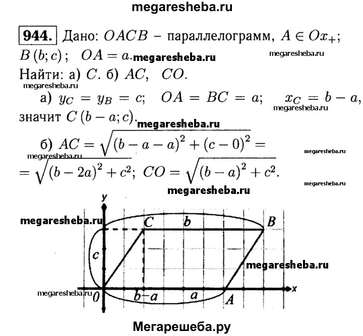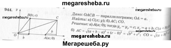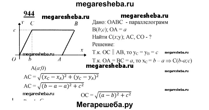 944 Вершина А параллелограмма ОАСВ лежит на положительной полуоси Ох, вершина В имеет координаты (b; с), а ОА = а. Найдите: а) координаты вершины С; б) сторону АС и диагональ СО.