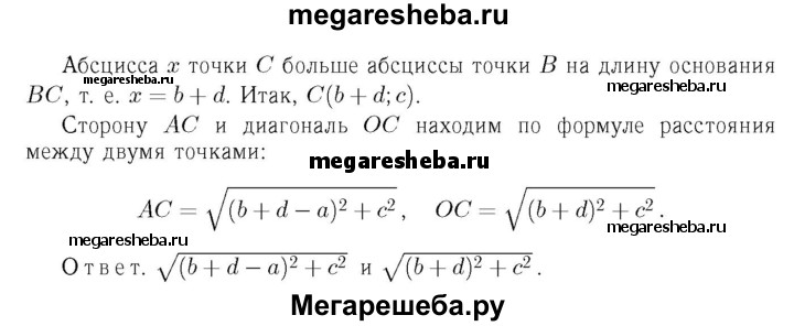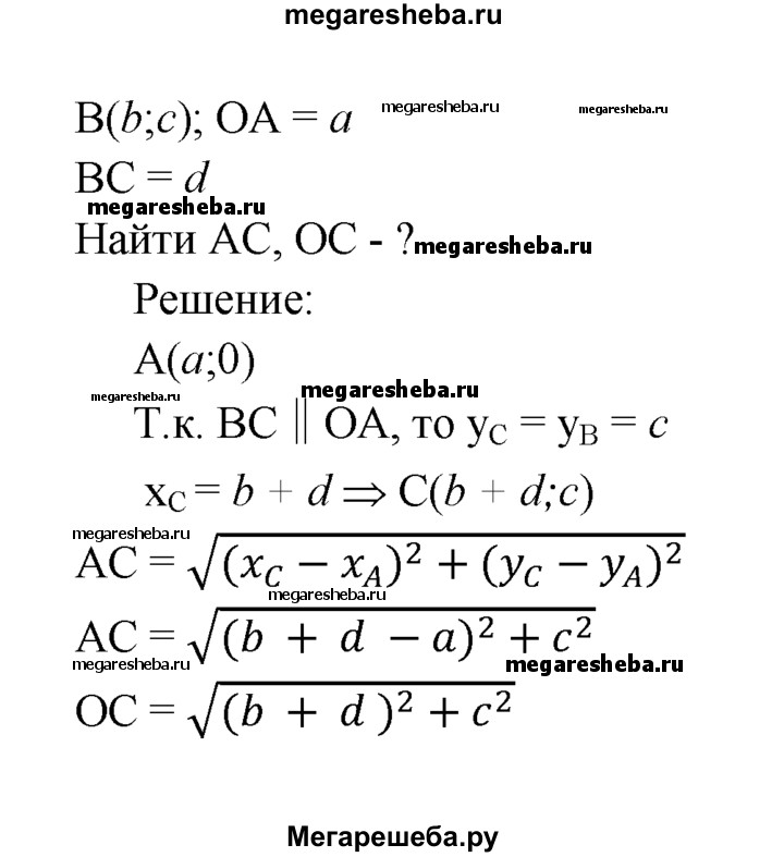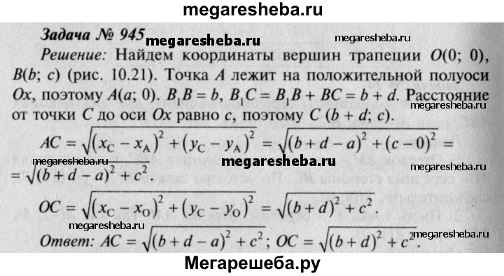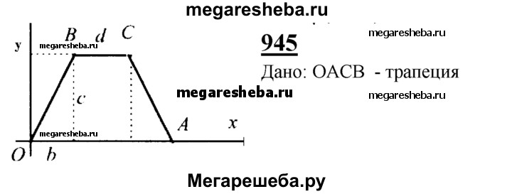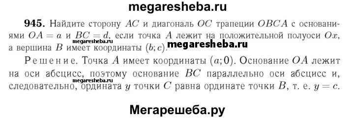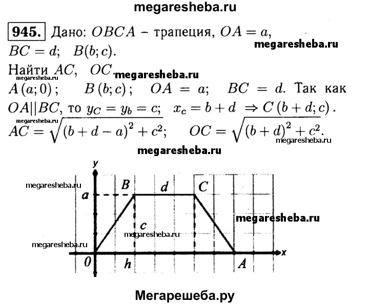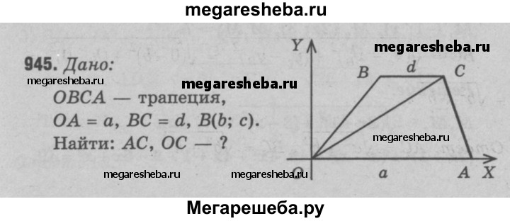 945 Найдите сторону АС и диагональ ОС трапеции ОВСА с основаниями OA = а и ВС = d, если точка А лежит на положительной полуоси Ох, а вершина В имеет координаты (b; с).