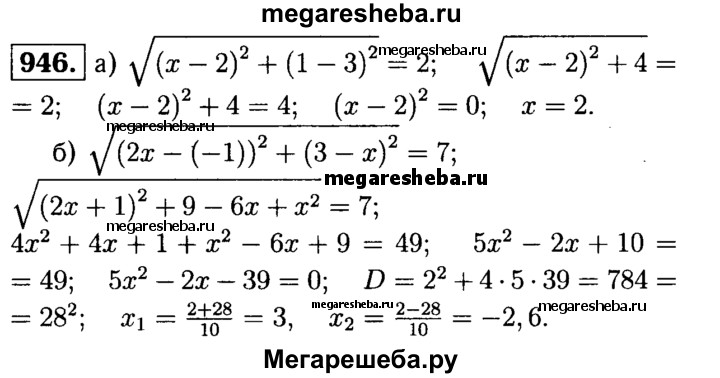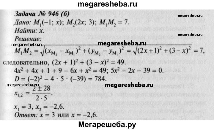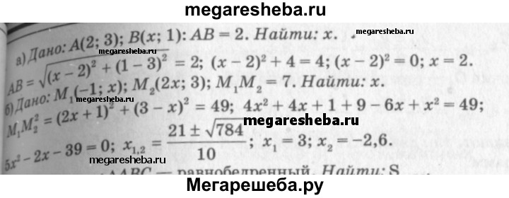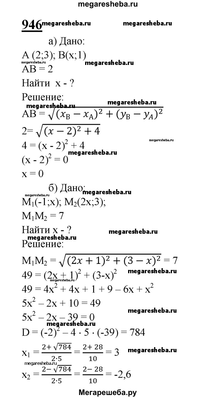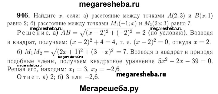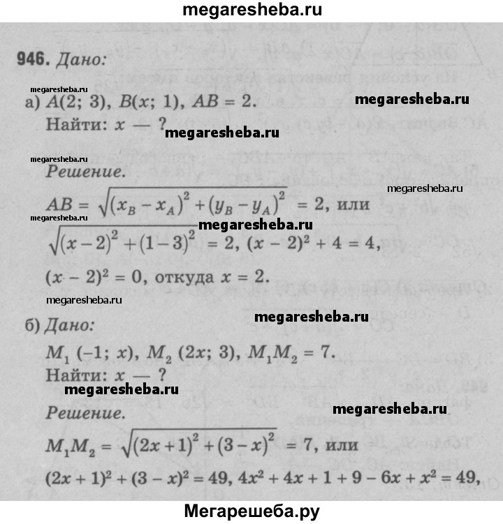 946 Найдите х, если: а) расстояние между точками А (2; 3) и В (х; 1) равно 2; б) расстояние между точками Мг (-1; х) и М2 (2х; 3) равно 7.