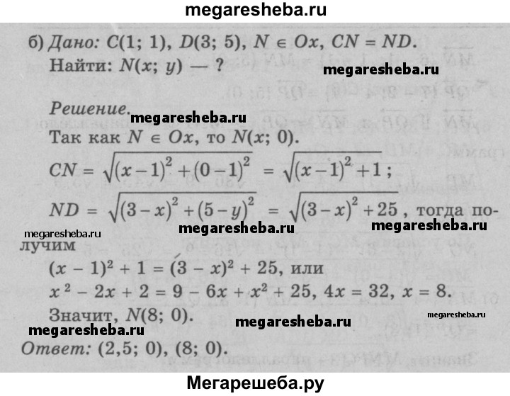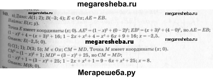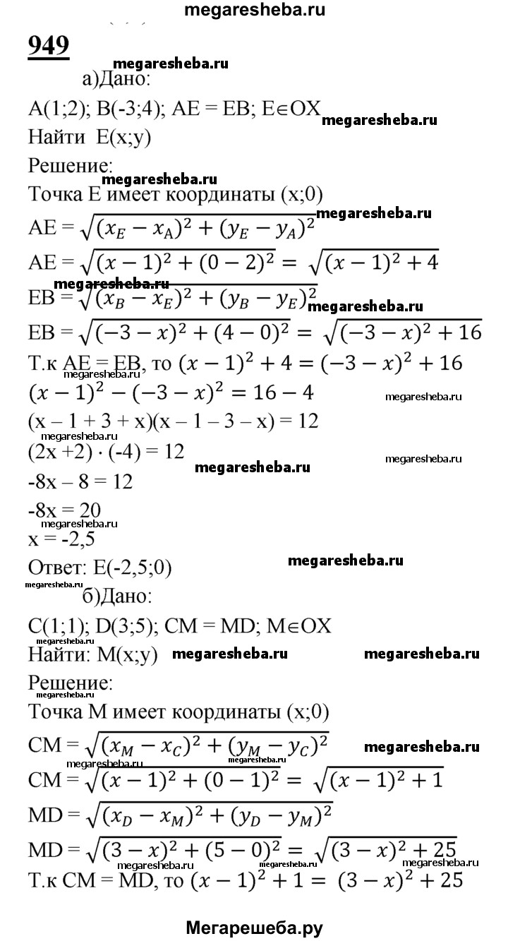 949 На оси абсцисс найдите точку, равноудалённую от точек: а) А (1; 2) и В (-3; 4); б) С (1; 1) и D (3; 5).