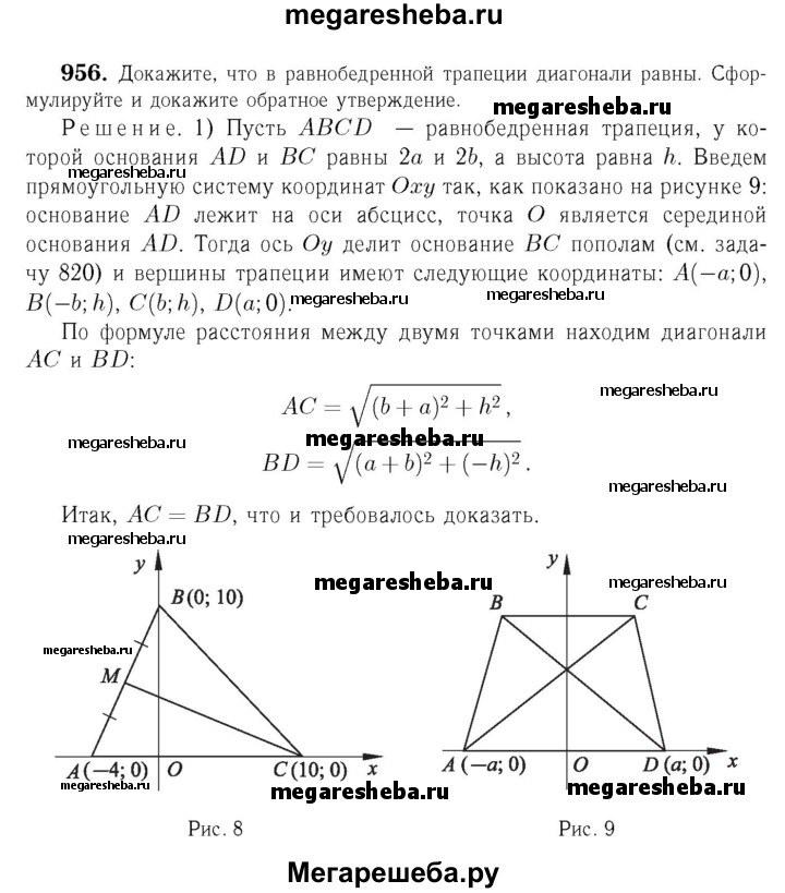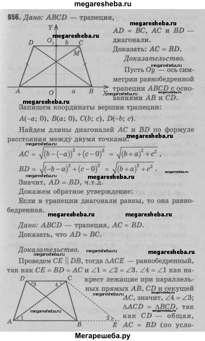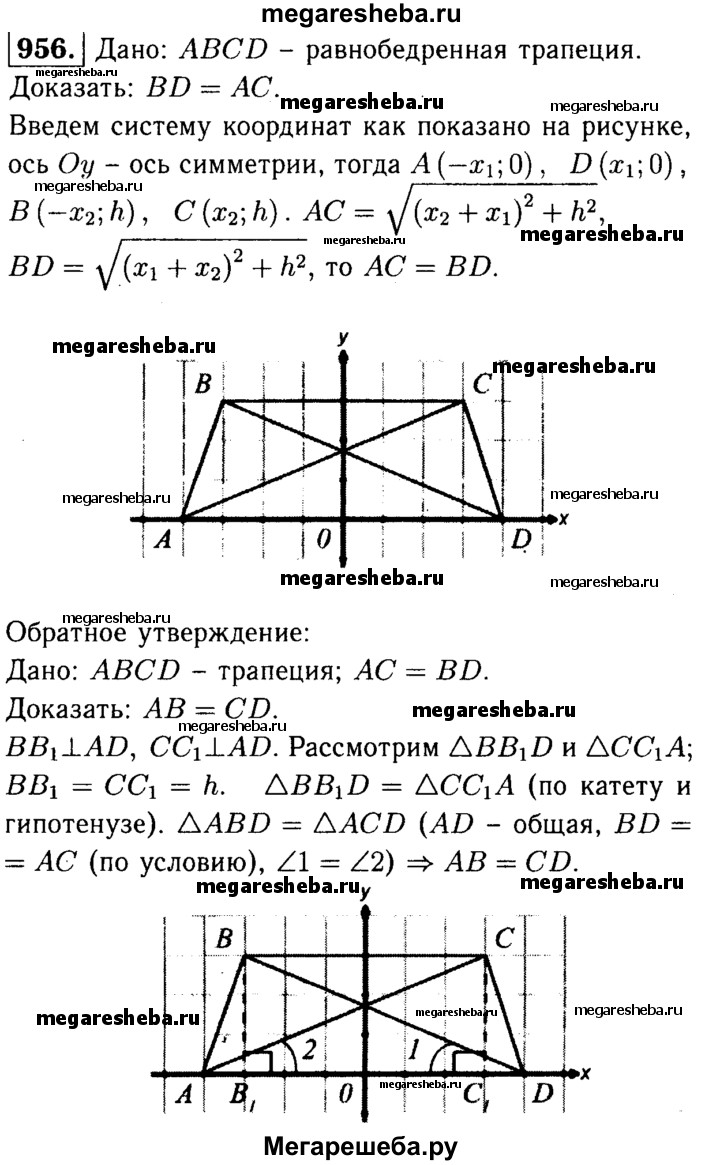 956 Докажите, что в равнобедренной трапеции диагонали равны. Сформулируйте и докажите обратное утверждение.