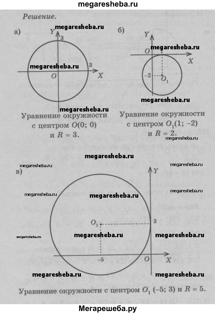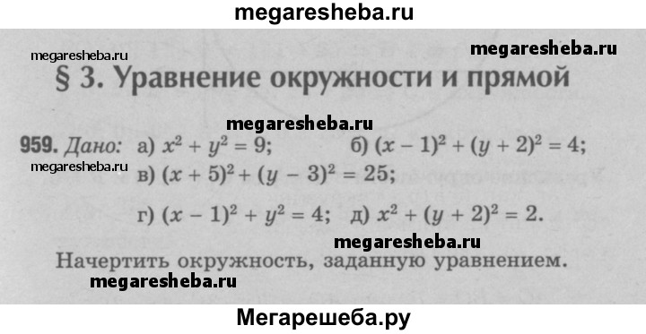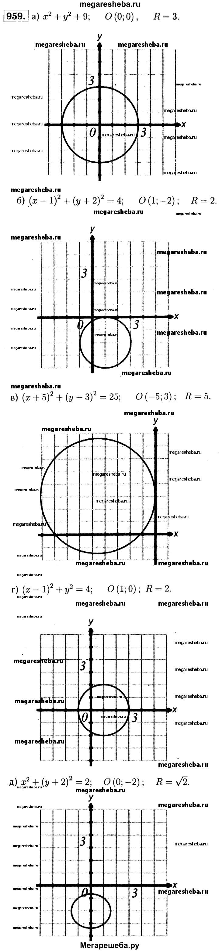 959 Начертите окружность, заданную уравнением: а) х2 + у2 = 9; б) (х - 1)2 + (у + 2)2 = 4; в) (х + 5)2 + (у -3)2 = 25; г) (х - 1)2 + y2 = 4; д) х2 + (у + 2)2 = 2.