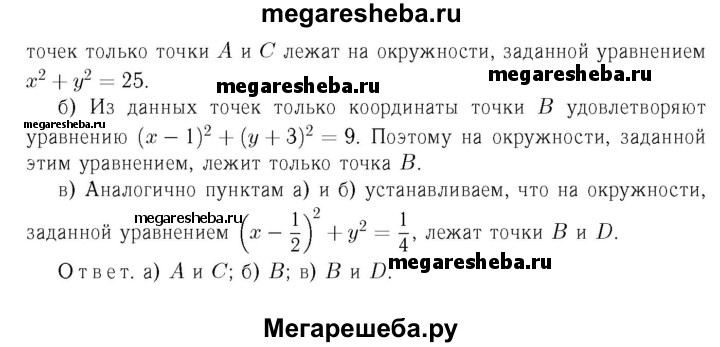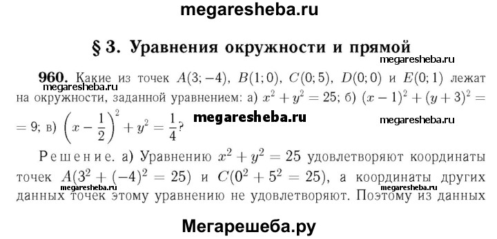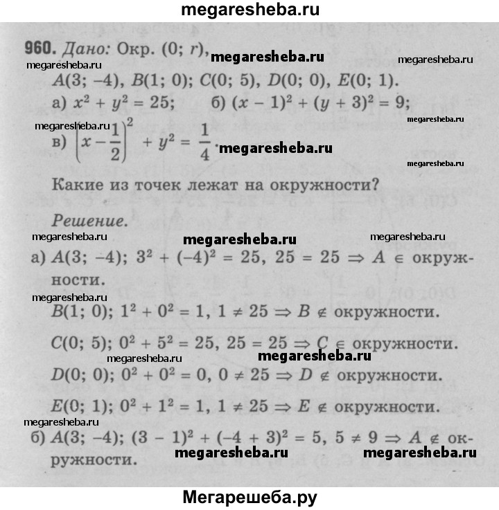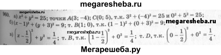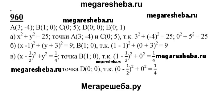960 Какие из точек А (3; -4), В (1; 0), С (0; 5), D (0; 0) и Е (0; 1) лежат на окружности, заданной уравнением: а) х2 + у2 = 25; б) (х - 1)2 + (у + 3)2 = 9; в) ( х- ½ )- у2 = ¼