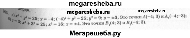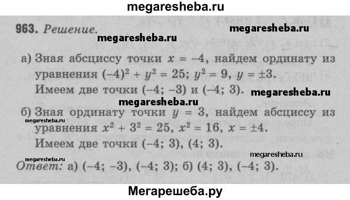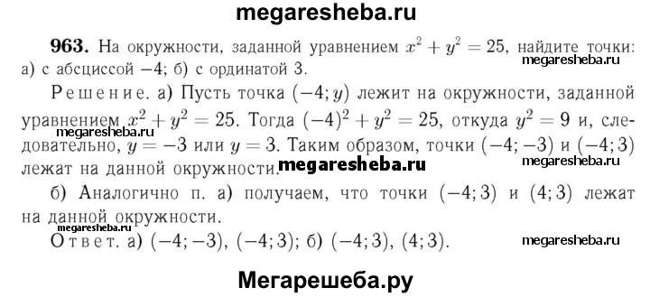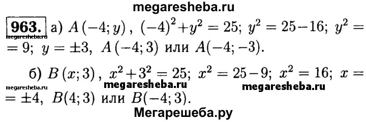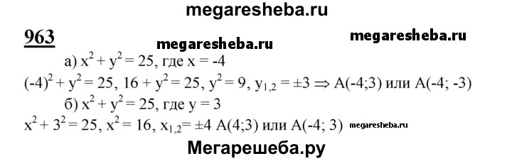 963 На окружности, заданной уравнением х2 + у2 = 25, найдите точки: а) с абсциссой -4; б) с ординатой 3.