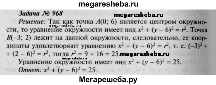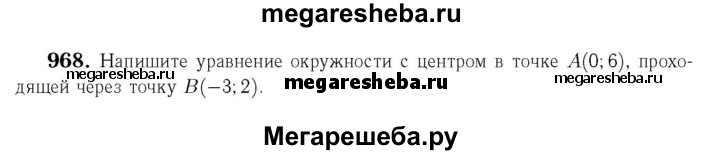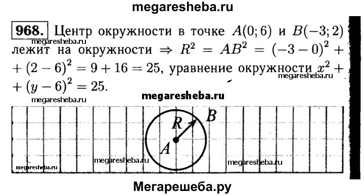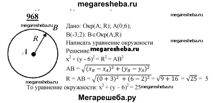 968 Напишите уравнение окружности с центром в точке А (0; 6), проходящей через точку В (-3; 2).