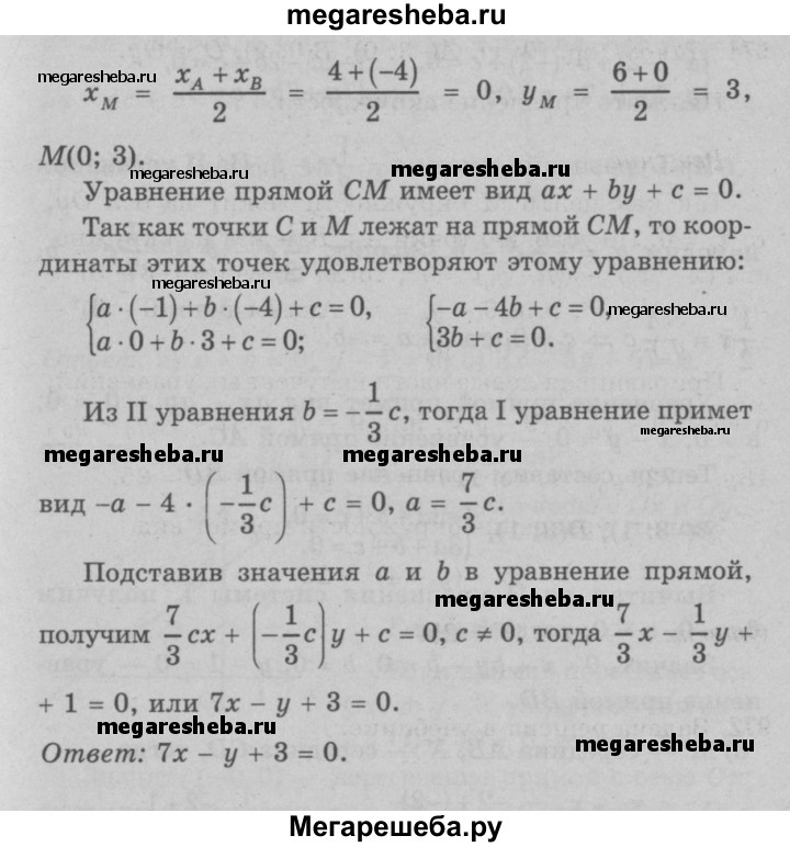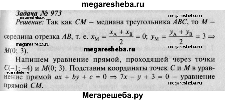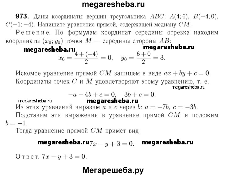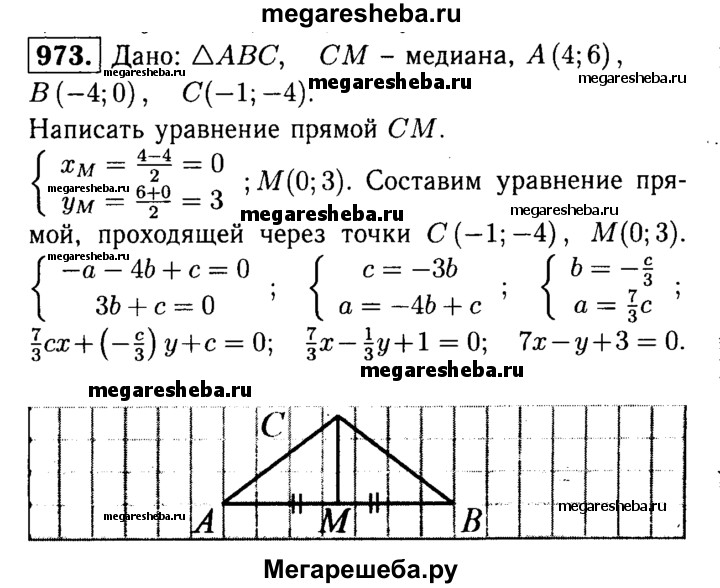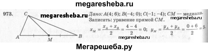 973 Даны координаты вершин треугольника ABC: А (4; 6), В (-4; 0), С (-1; -4). Напишите уравнение прямой, содержащей медиану СМ.