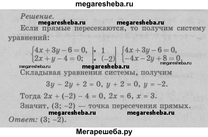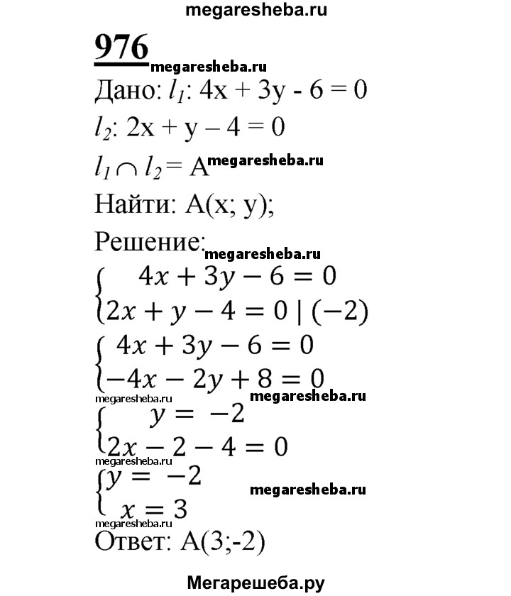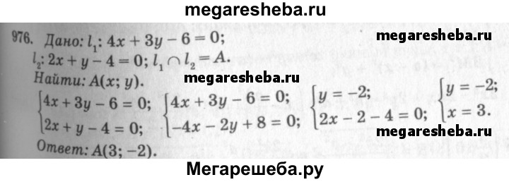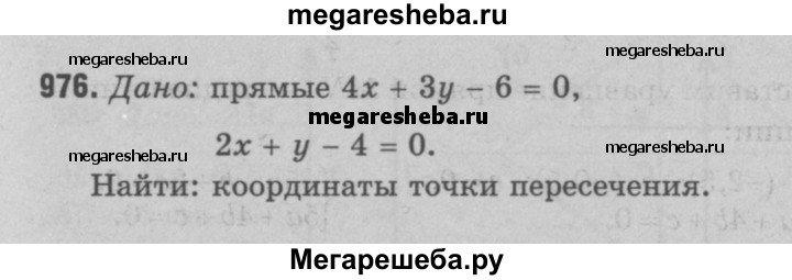 976 Найдите координаты точки пересечения прямых 4х + 3у - 6 = О и 2х + у - 4 = 0.