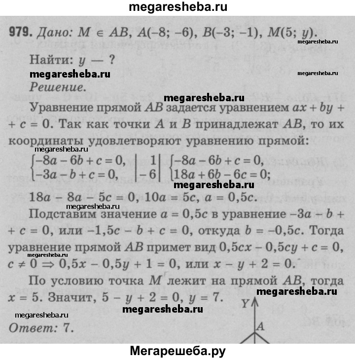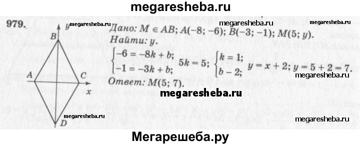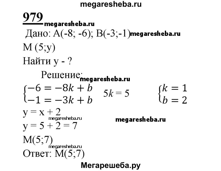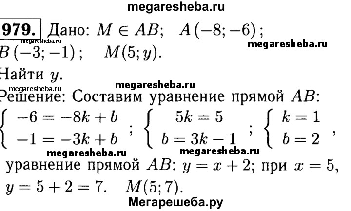 979 О Найдите ординату точки М, лежащей на прямой АВ, если известно, что А (-8; -6), В (-3; -1) и абсцисса точки М равна 5.