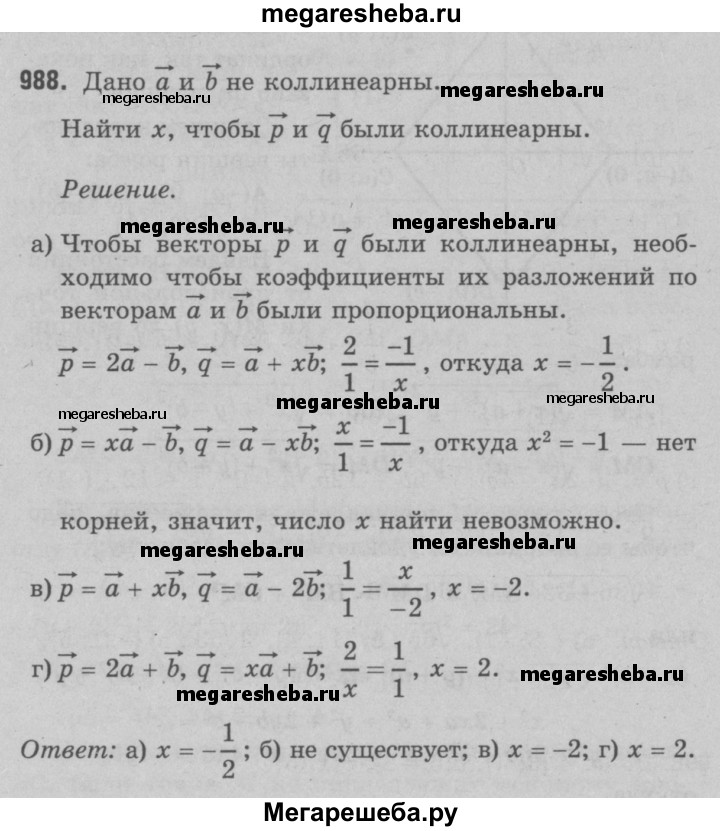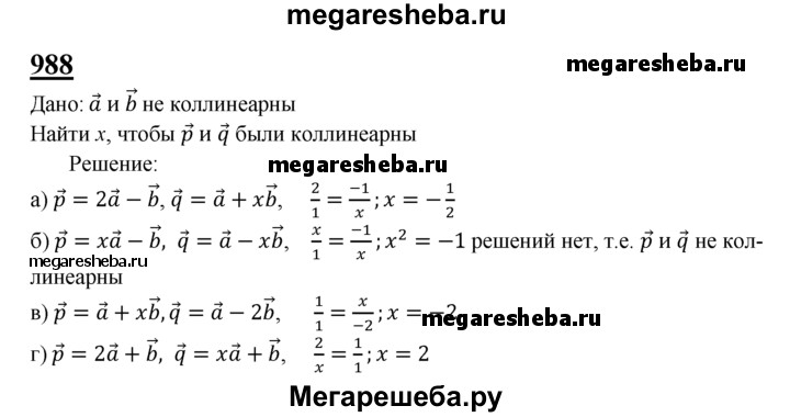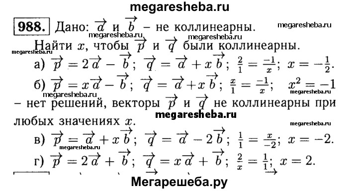 988 Векторы а и b не коллинеарны. Найдите такое число х (если это возможно), чтобы векторы р и q были коллинеарны: а) р = 2а-b, q = a + xb; б) p-xa-b, q-a + xb; в) p — a + xb, q-a- 2b; r) p = 2a + b, q = xa + b.