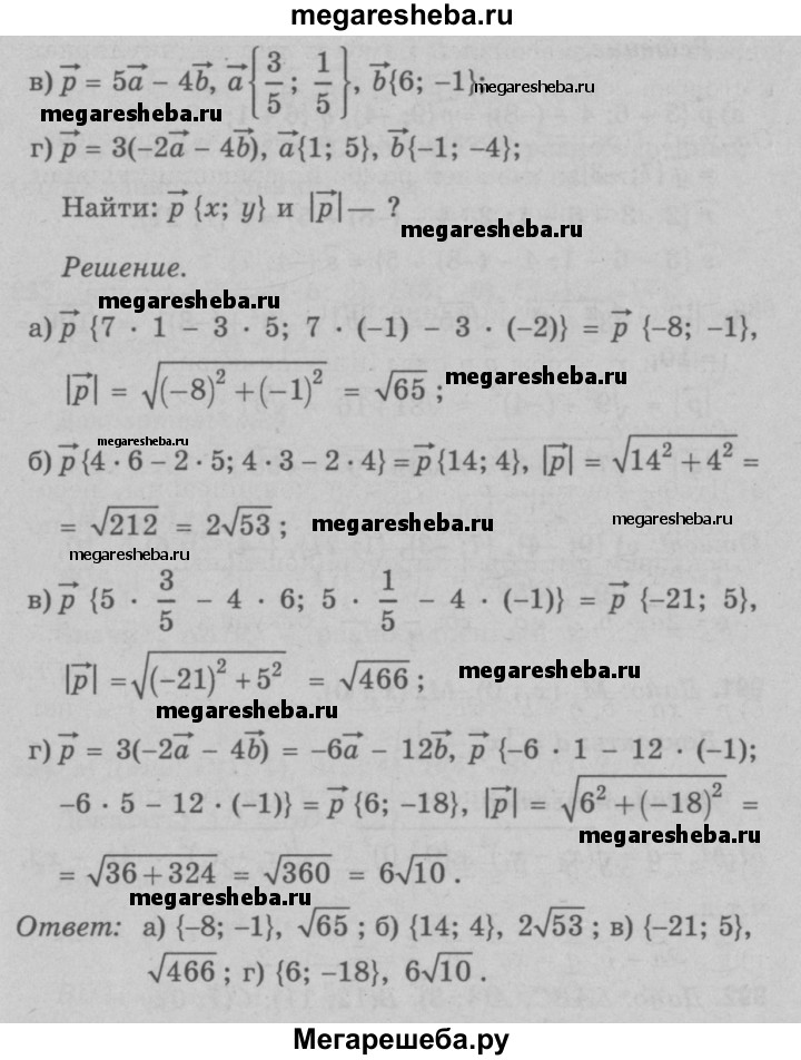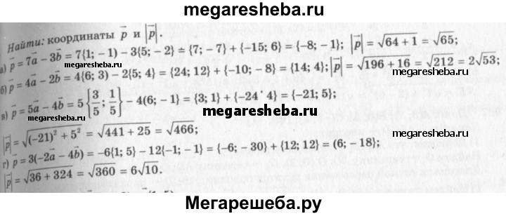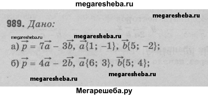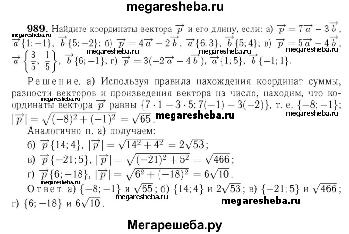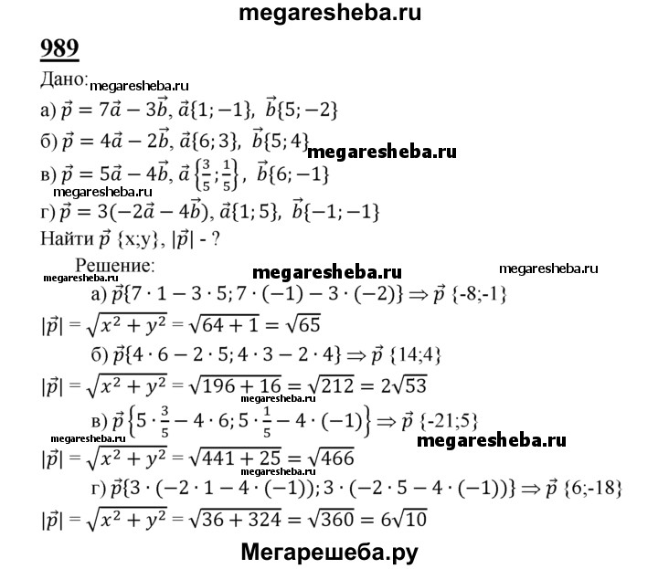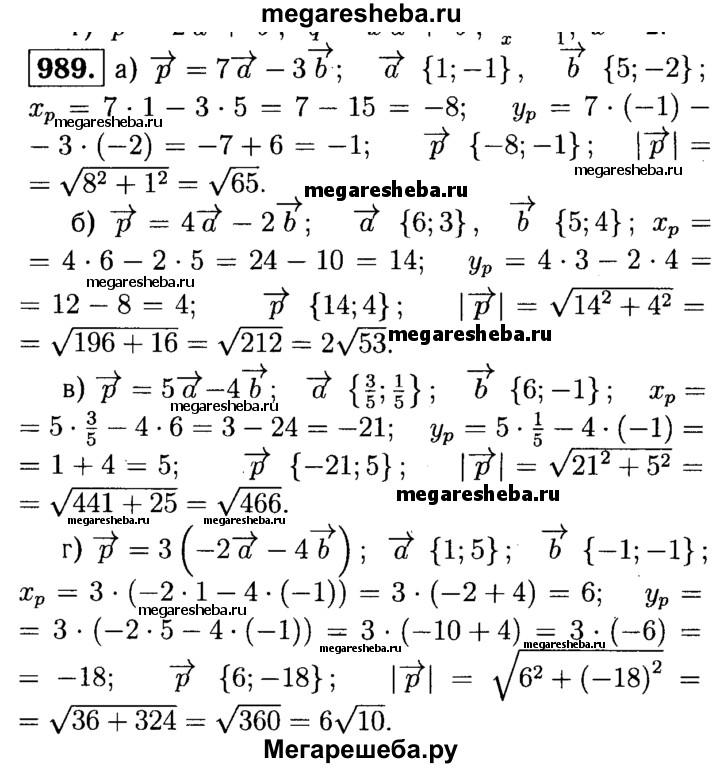 989 Найдите координаты вектора p и его длину, если: а) р=7а-3b, а {1; -1}, b{5;-2}; б) р = 4а-2b, а {6; 3}, b{5; 4}; в) р = 5а-4b, а b {6; -1}; г) р = 3(-2а-4b), а{1; 5}, b {-1;-1}.