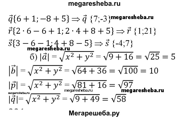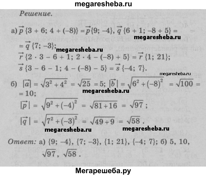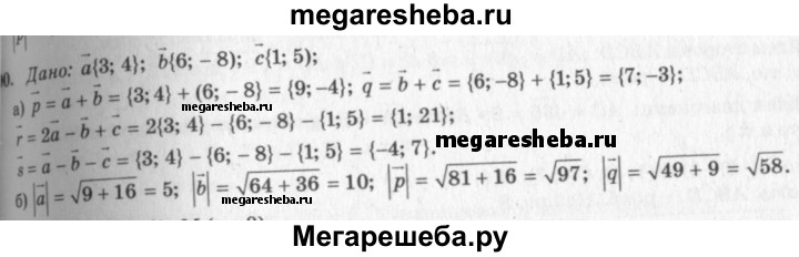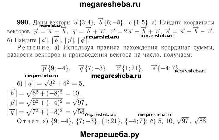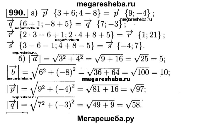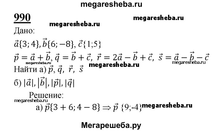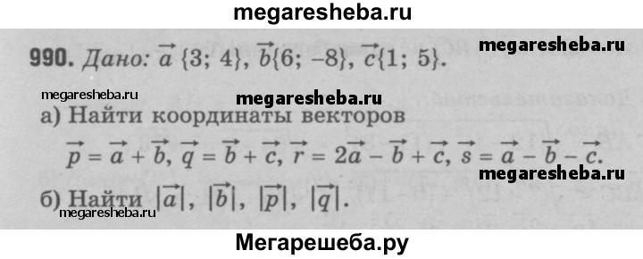 990 Даны векторы а{3; 4}, b{6;-8}, с{1; 5}. а) Найдите координаты векторов р = a + b, q ~ b + с, r = 2а - b + с, s = а - b - с. б) Найдите |а|, |b|, |р|, |q|.
