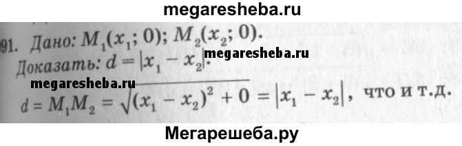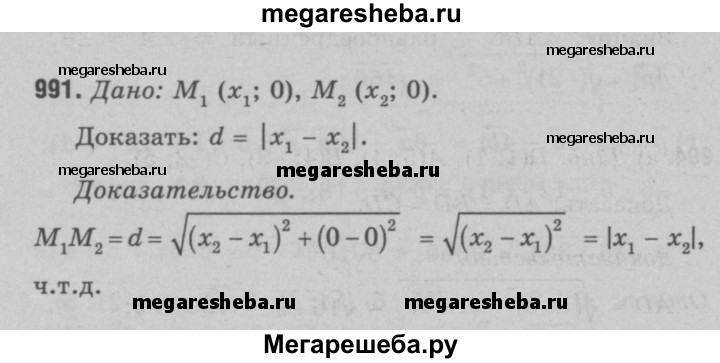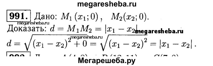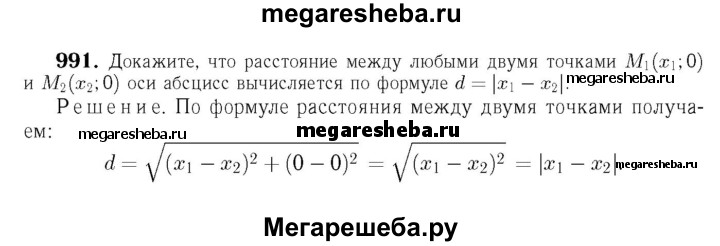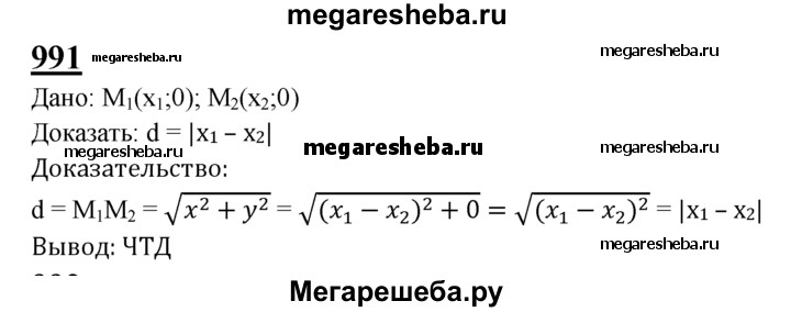 991 Докажите, что расстояние между любыми двумя точками М1(х1;0) и М2(х2;0) оси абсцисс вычисляется по формуле d — |Х1 - Х2|.