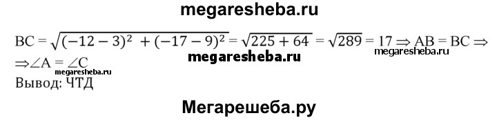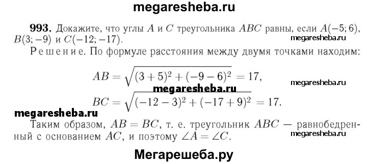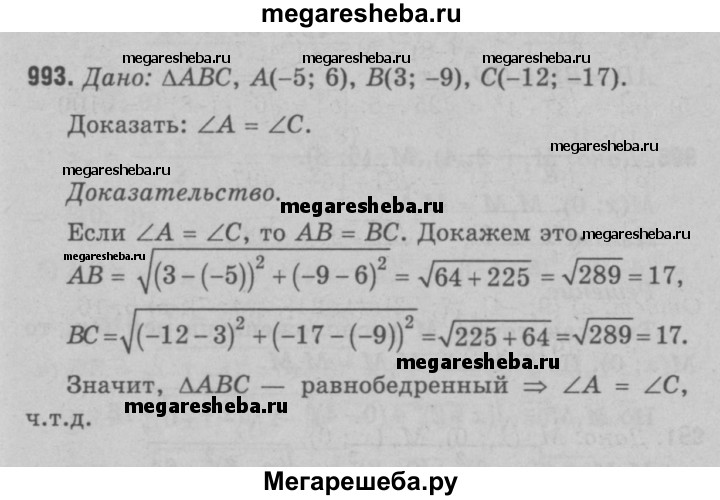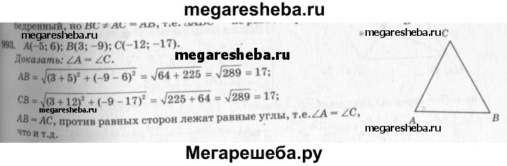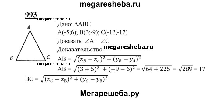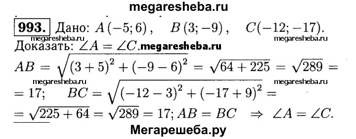 993 Докажите, что углы А и С треугольника ABC равны, если А (-5; 6), В (3; -9) и С (-12; -17).