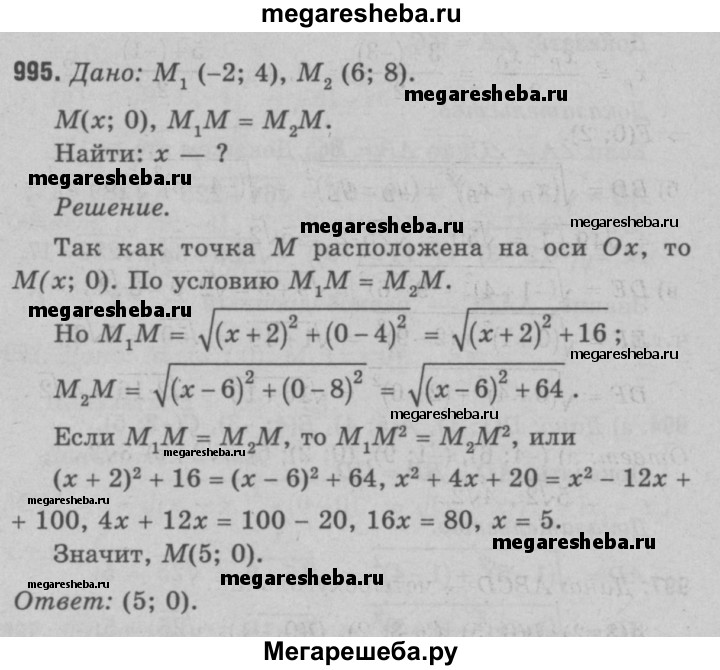 995 На оси абсцисс найдите точку, равноудалённую от точек М, (-2; 4) и М2 (6; 8).