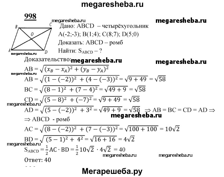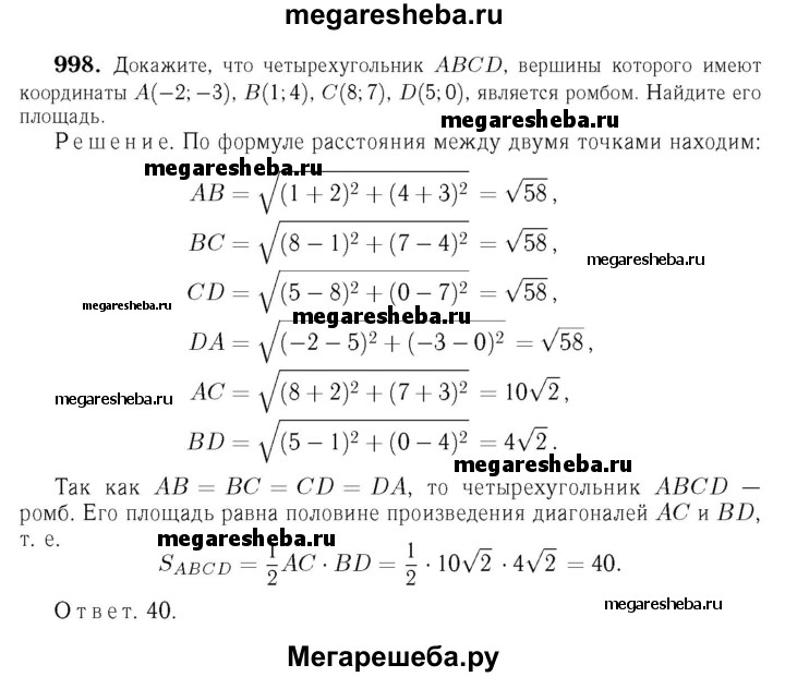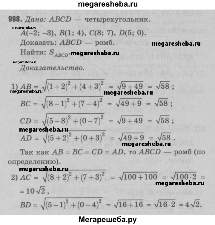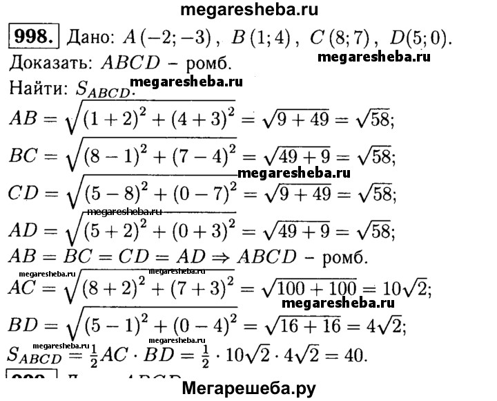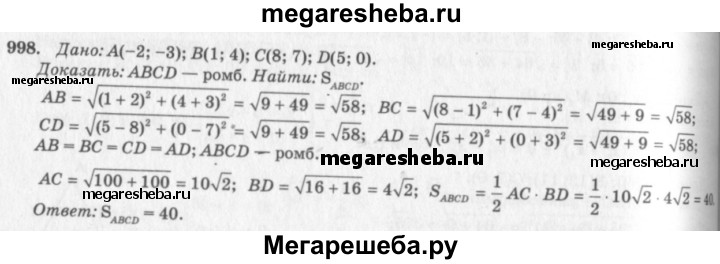 998 Докажите, что четырёхугольник ABCD, вершины которого имеют координаты А (-2; -3), В (1; 4), С (8; 7), D (5; 0), является ромбом. Найдите его площадь.