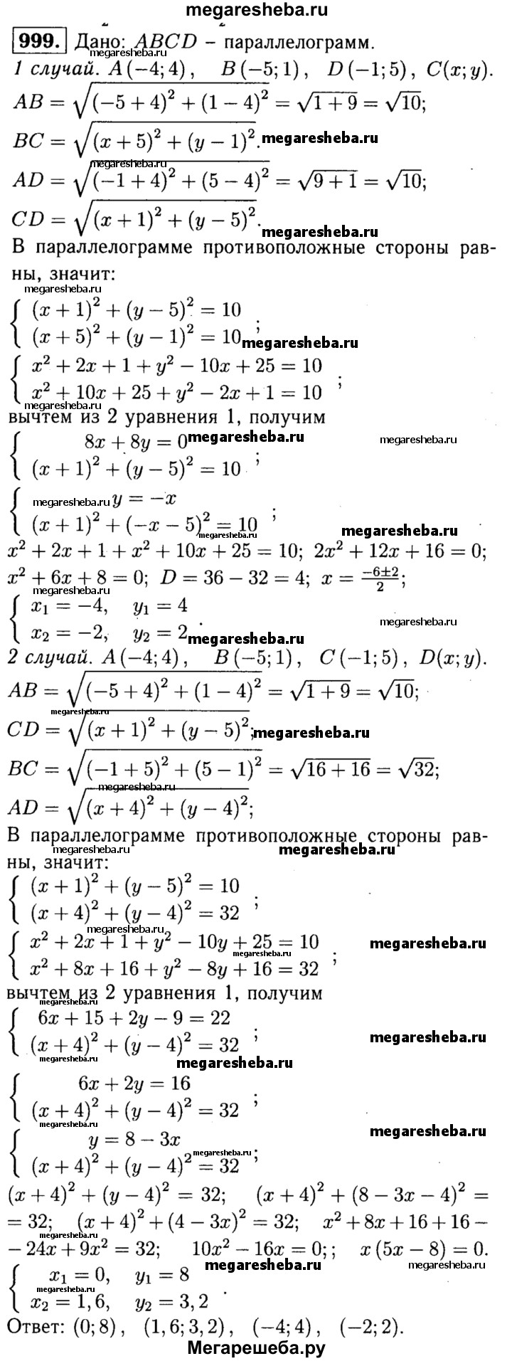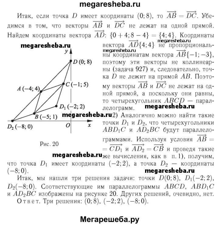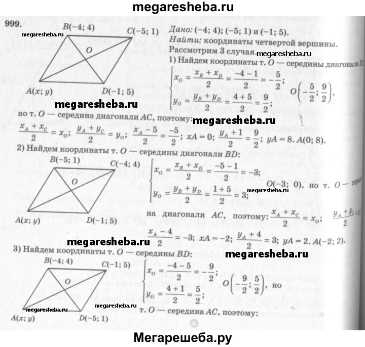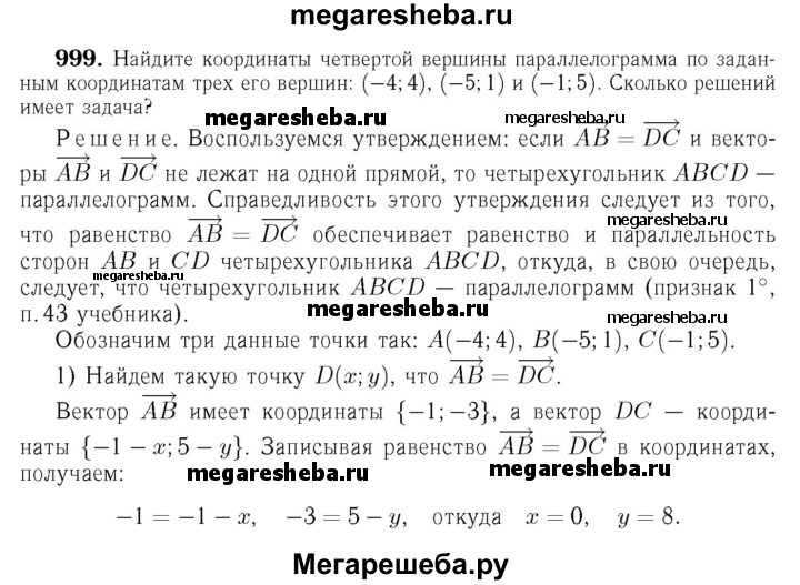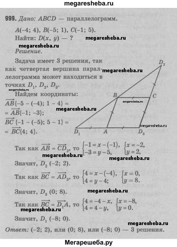 999 Найдите координаты четвёртой вершины параллелограмма по заданным координатам трёх его вершин: (-4; 4), (-5; 1) и (-1; 5). Сколько решений имеет задача?