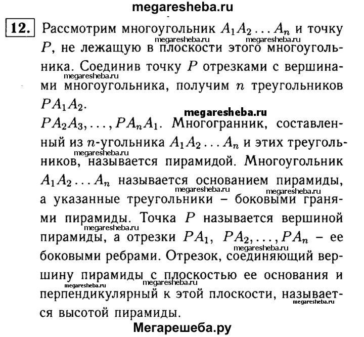 12 Объясните, какой многогранник называется n-угольной пирамидой; что такое основания, боковые грани, вершина, боковые рёбра и высота пирамиды.