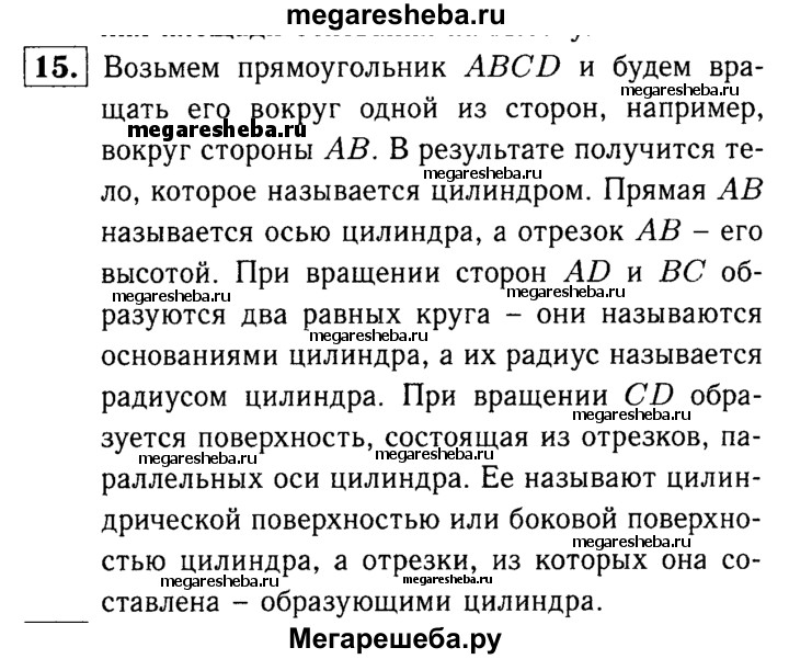 15 Объясните, какое тело называется цилиндром; что такое ось, высота, основания, радиус, боковая поверхность, образующие цилиндра.