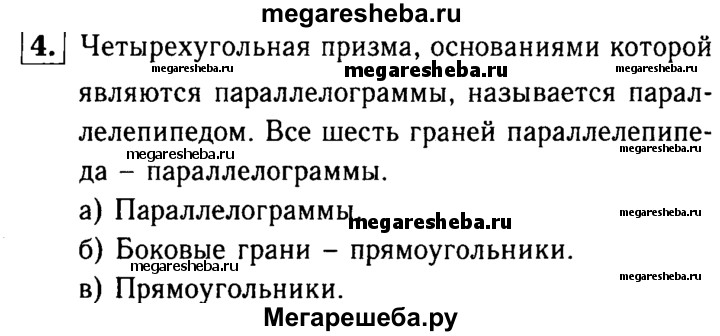 4 Объясните, что такое параллелепипед; какие многоугольники являются гранями: а) параллелепипеда; б) прямого параллелепипеда; в) прямоугольного параллелепипеда.