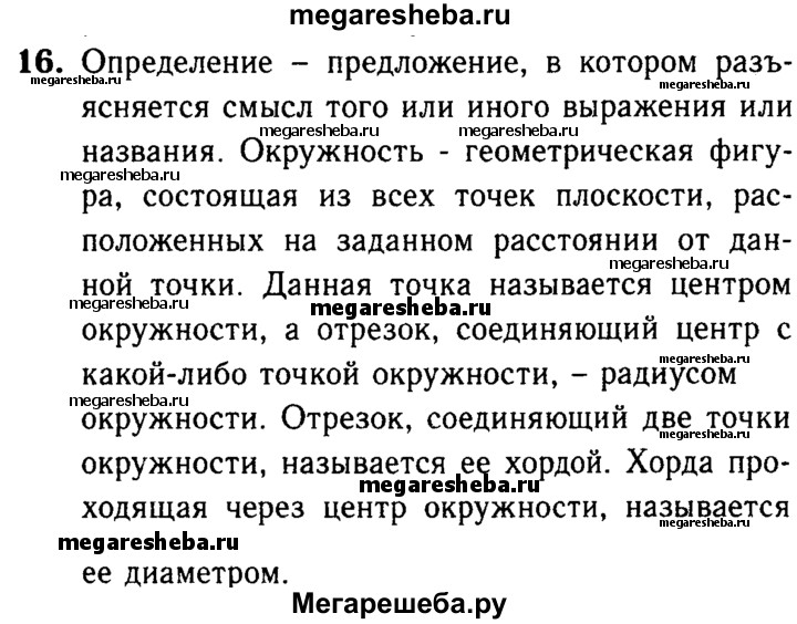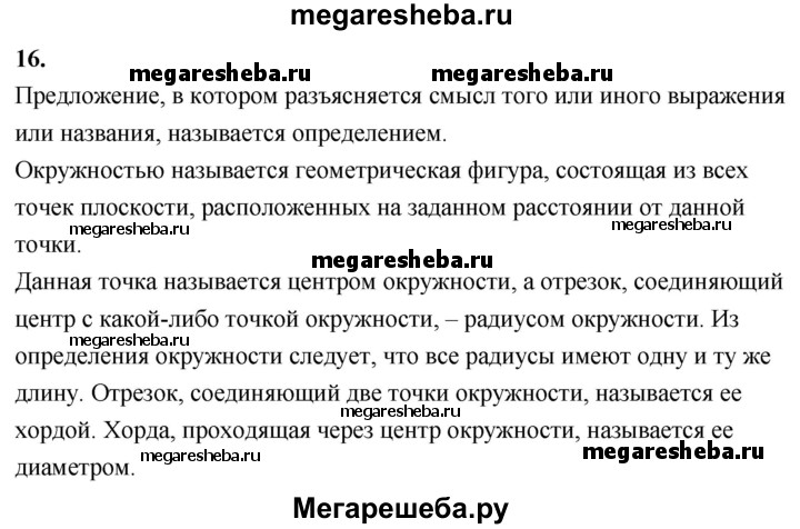 16 Что такое определение? Дайте определение окружности. Что такое центр, радиус, хорда и диаметр окружности?
