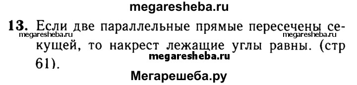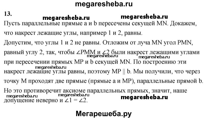 13 Докажите, что при пересечении двух параллельных прямых секущей накрест лежащие углы равны.